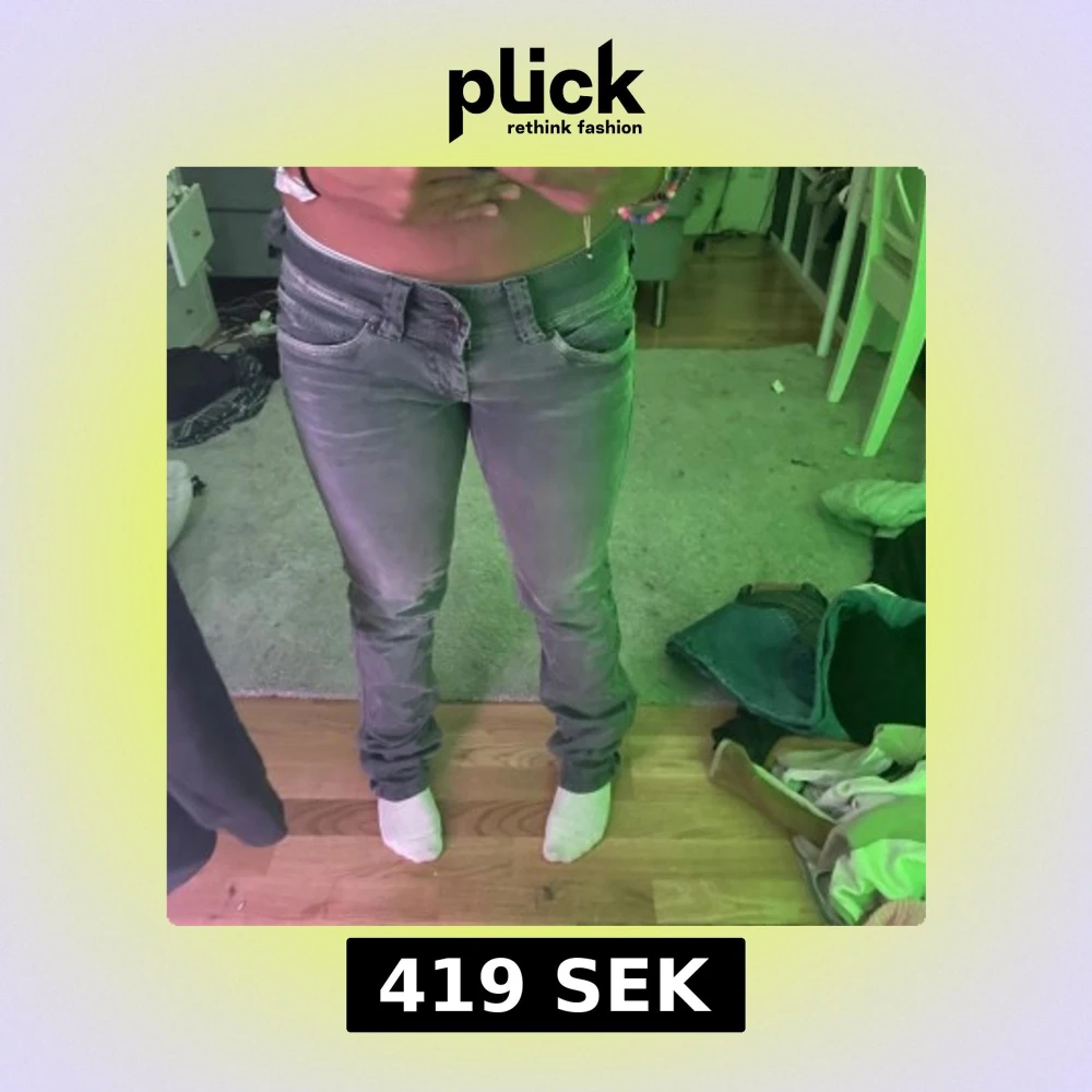 Säljer ett par grå jeans med låg midja och bootcut ben. Jeansen har klassisk femficksdesign, bälteshällor och dragkedjegylf. Snygg tvättad look och passar perfekt till en avslappnad stil. Stilig design på bakfickor.