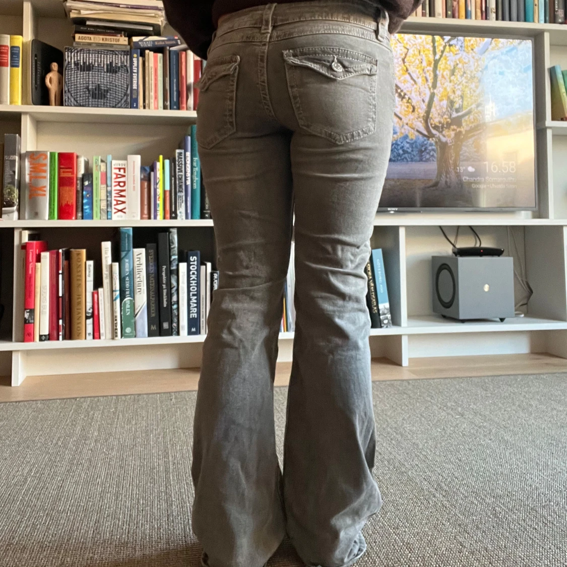 Snygga grå jeans med bootcut passform och lågmidja. Byxorna har coola ficklock bak med knapp och markerade sömmar. Perfekta för dig som gillar en retrovibe och vill ha något som sticker ut lite extra.