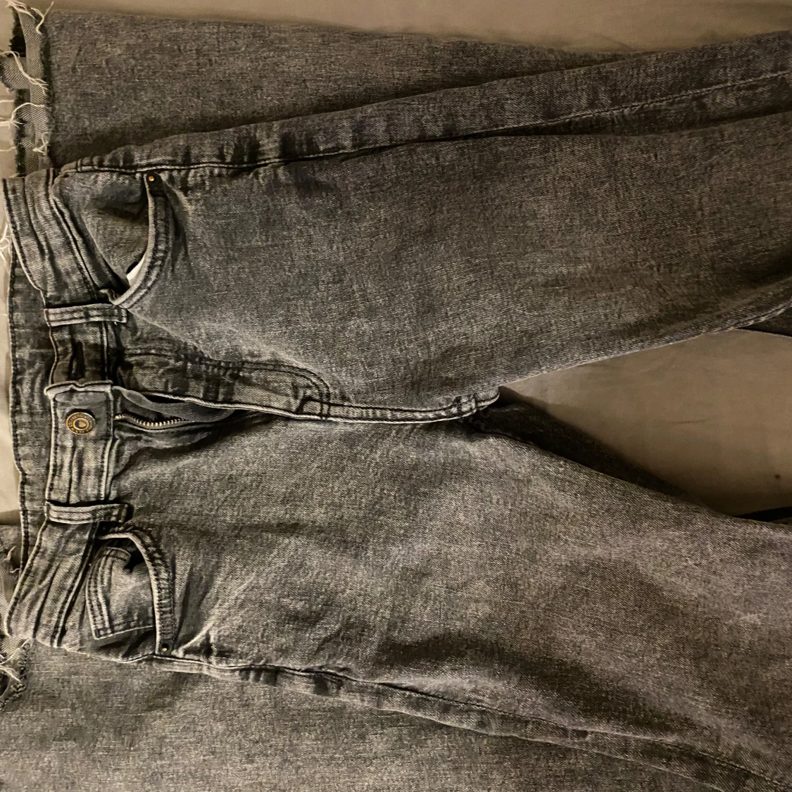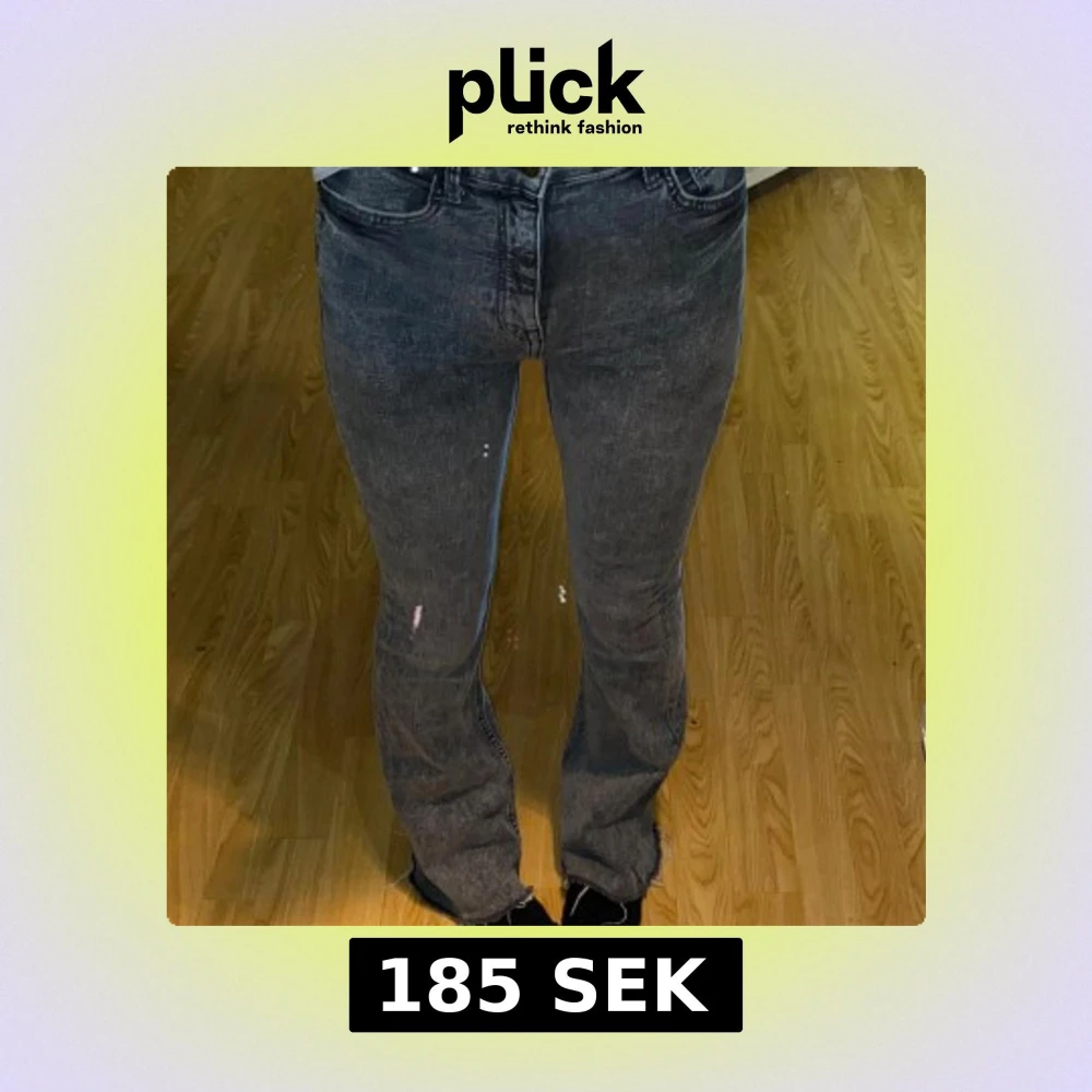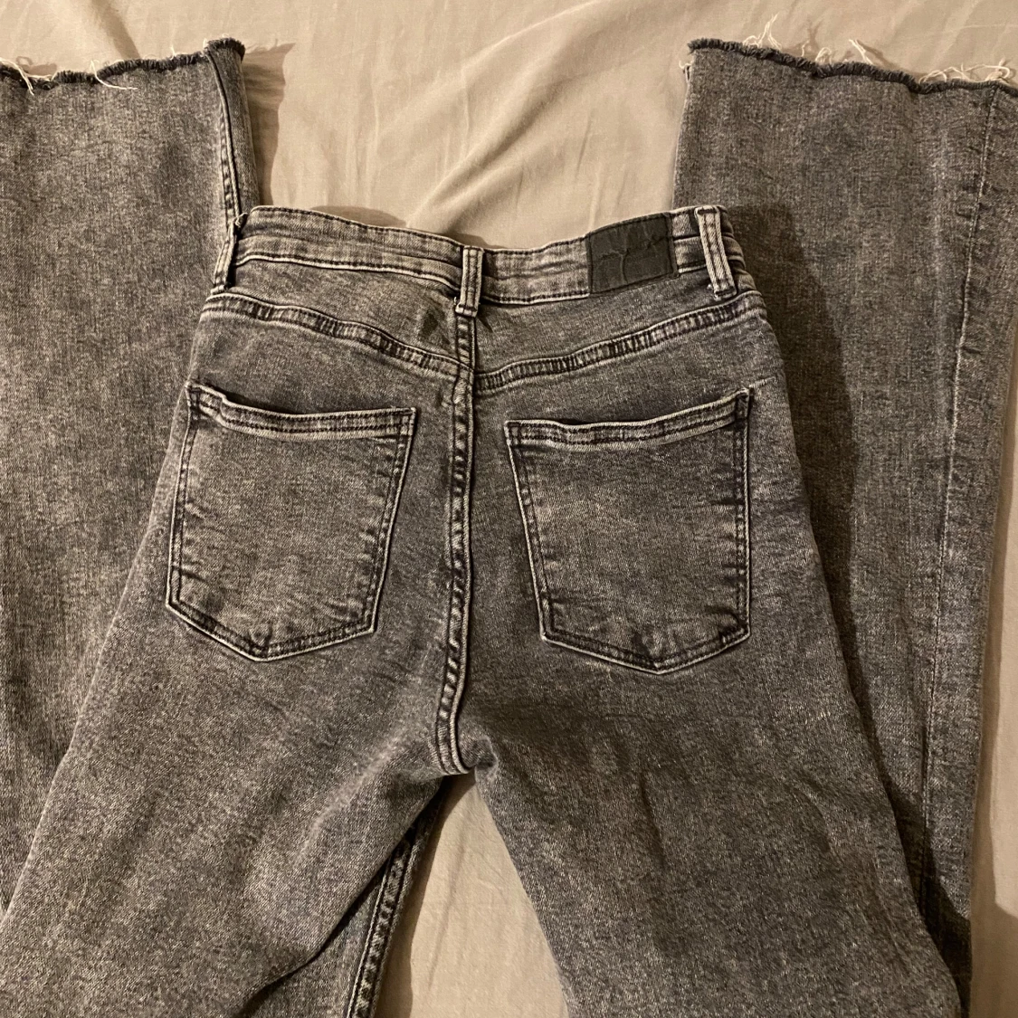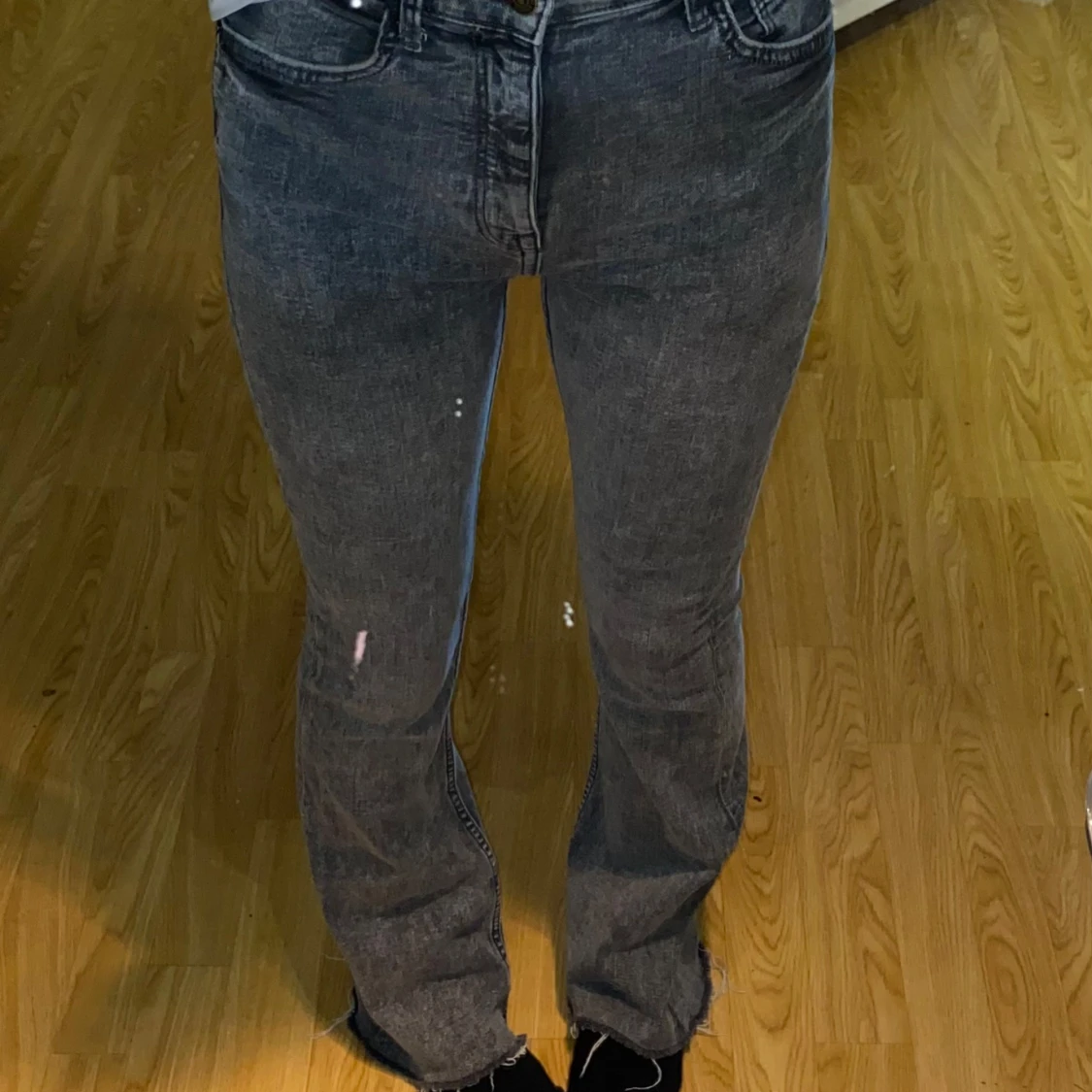 Säljer ett par grå jeans med bootcut-modell från Berhska köpta i Tyskland. Jeansen har fickor och är mid waist. Materialet är denim i bomull och de har en snygg tvättad look som ger en cool vibe. Klippta nertill men syns inte då det ser ut som en design.