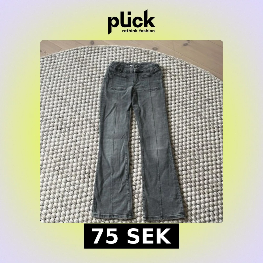 Snygga grå jeans med bootcut-modell och markerade raka sömmar längs benen. Byxorna har två stora fickor fram och bak, dubbla knappar i midjan och bälteshällor. Perfekta för dig som gillar en retrovibe och vill ha ett par jeans som sticker ut.