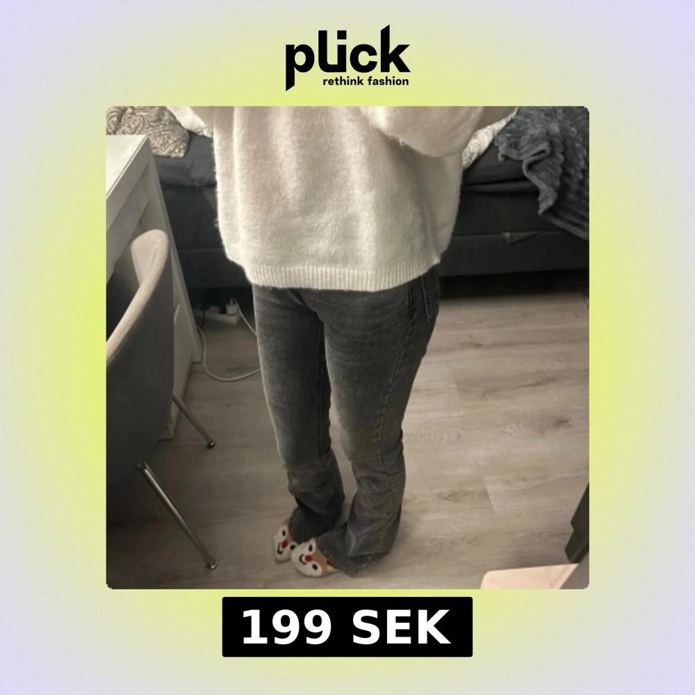 Köpta för 499, använda 1 gång. Ett par grå jeans med tvättad effekt och bootcut-modell. Jeansen har klassisk femficksdesign och normal passform upptill som blir utsvängd nertill. Materialet är jeans och färgen är en snygg mörkgrå ton.