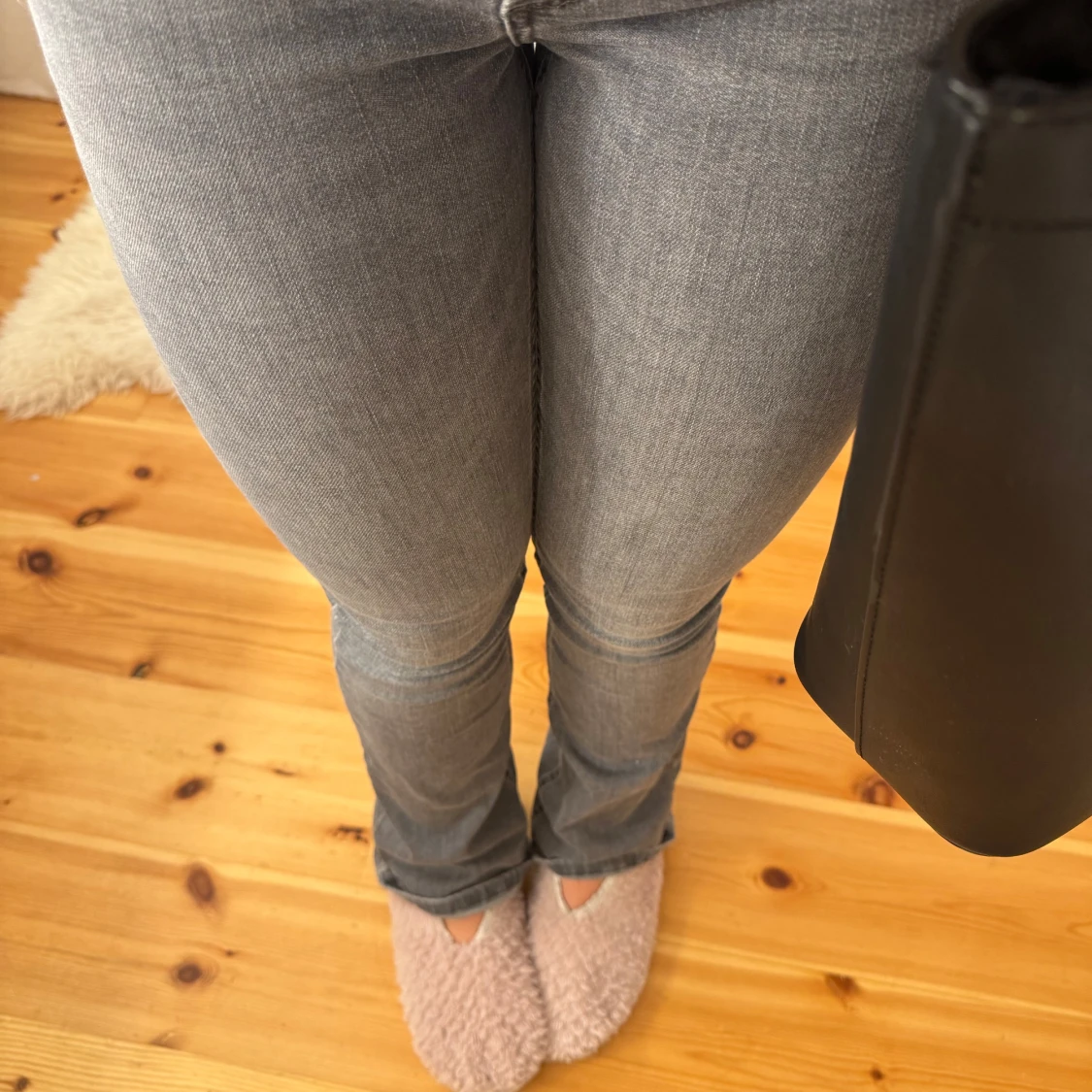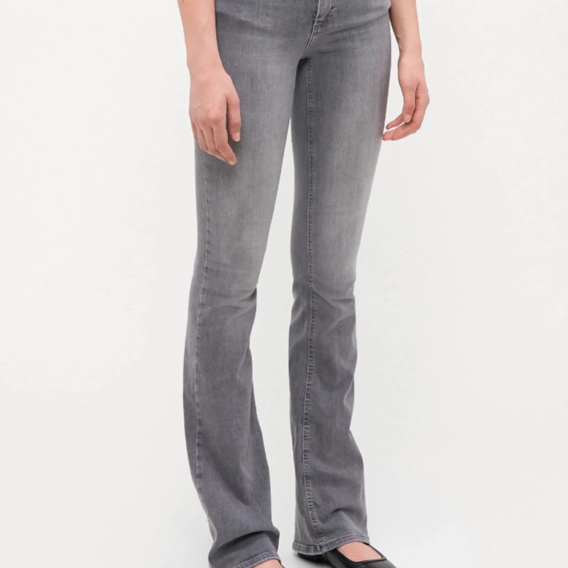 Snygga grå bootcut jeans med en klassisk look. Perfekta för en stilren outfit. De har en bekväm passform och är tillverkade i ett mjukt material. Nypris 600kr.