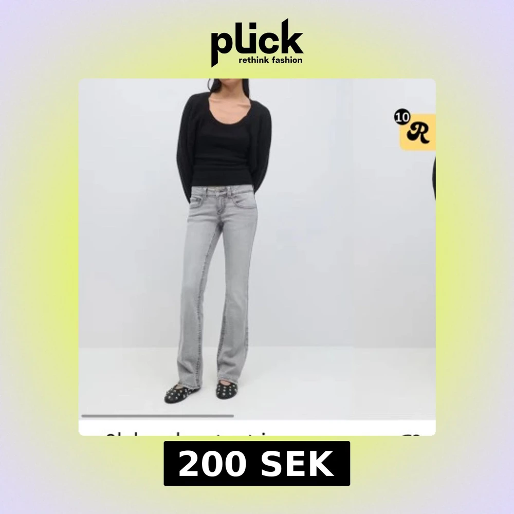 Snygga grå bootcut jeans med låg midja och dekorativa bakfickor med knappar. Perfekta för en stilren look. Knappt använda Max 5 ggr! Från Gina, skriv privat för bild
