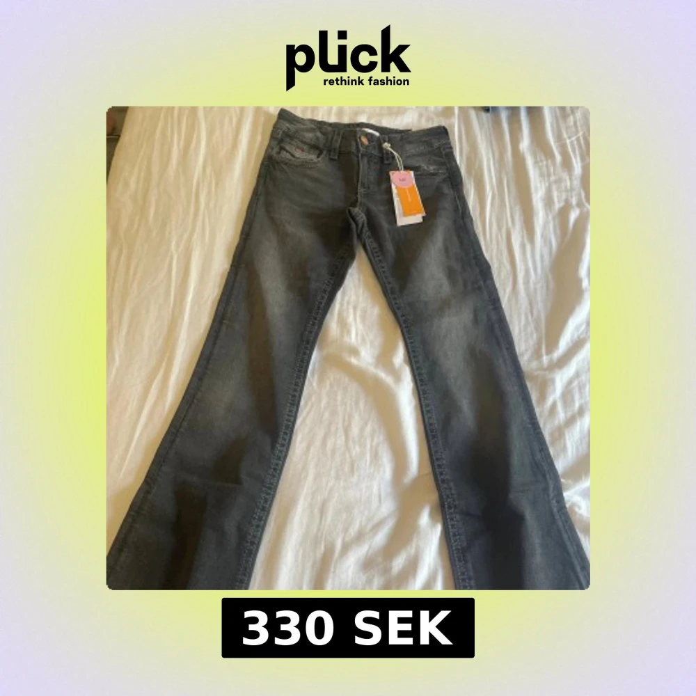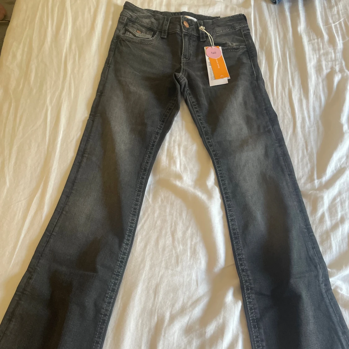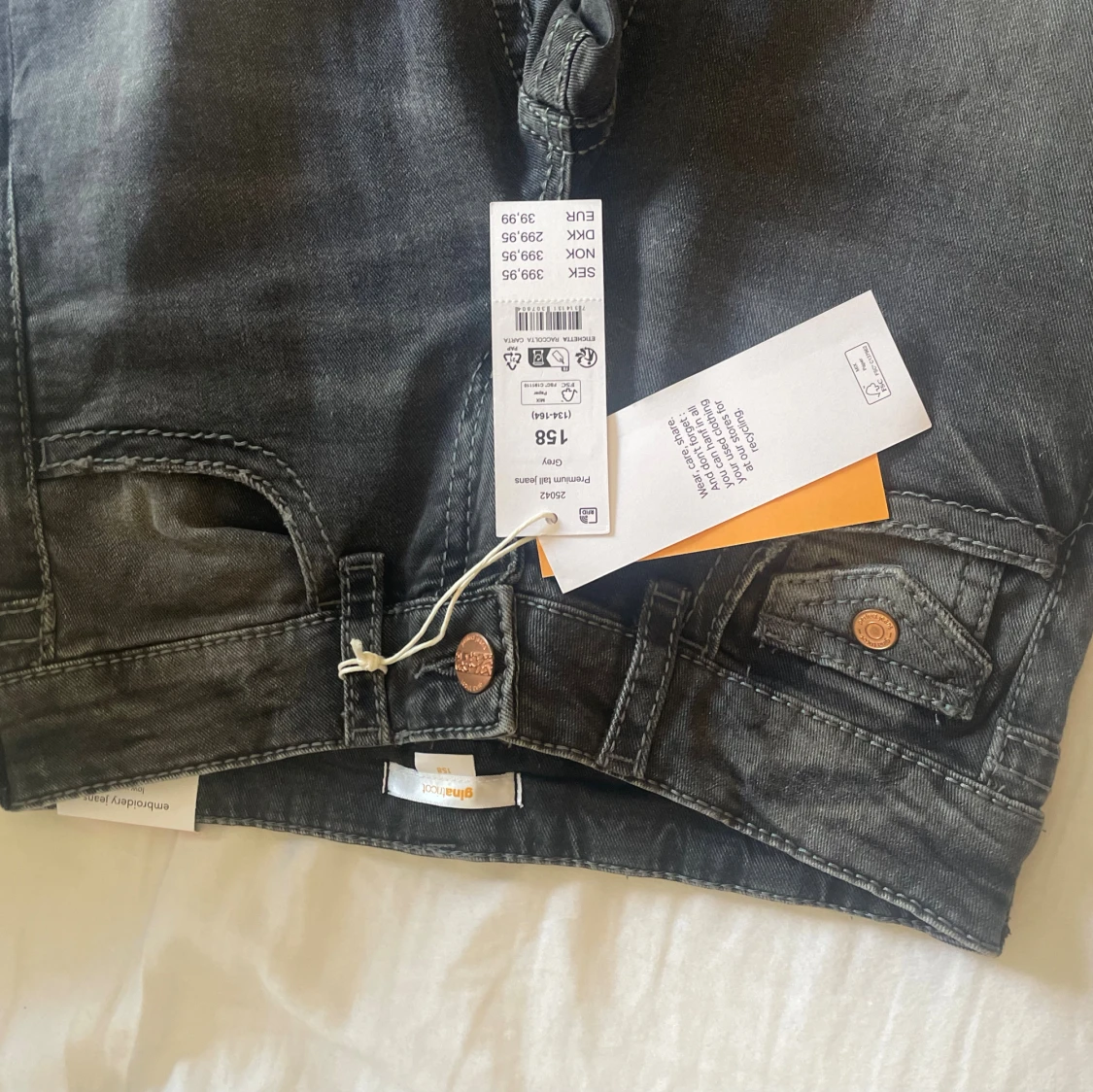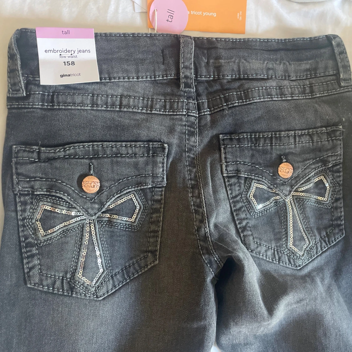 Snygga grå jeans från Gina Tricot med låga midja och broderade detaljer i form av rosetter på bakfickorna. Jeansen har raka ben och klassisk femficksdesign. Perfekta för dig som gillar en cool och trendig look. Dem passar folk som Anväder S stretchiga vid midjan ej använda