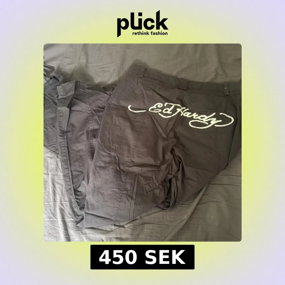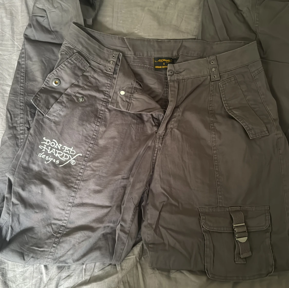 Säljer ett par grå cargobyxor från Ed Hardy med stora fickor och coola spänndetaljer. Sjukt fräscha! Unika o knappt använda alls.