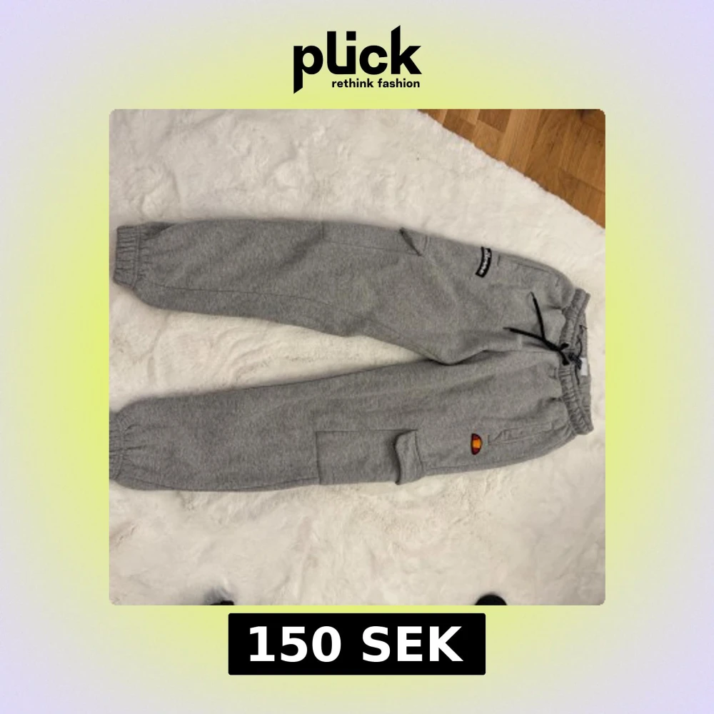 Snygga grå cargopants från Ellesse med elastisk midja och svarta snören. Byxorna har flera fickor, inklusive sidofickor med lock, och ribbade muddar vid bensluten. Perfekt för chill dagar och streetwear-stil.