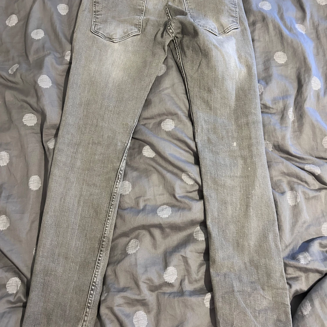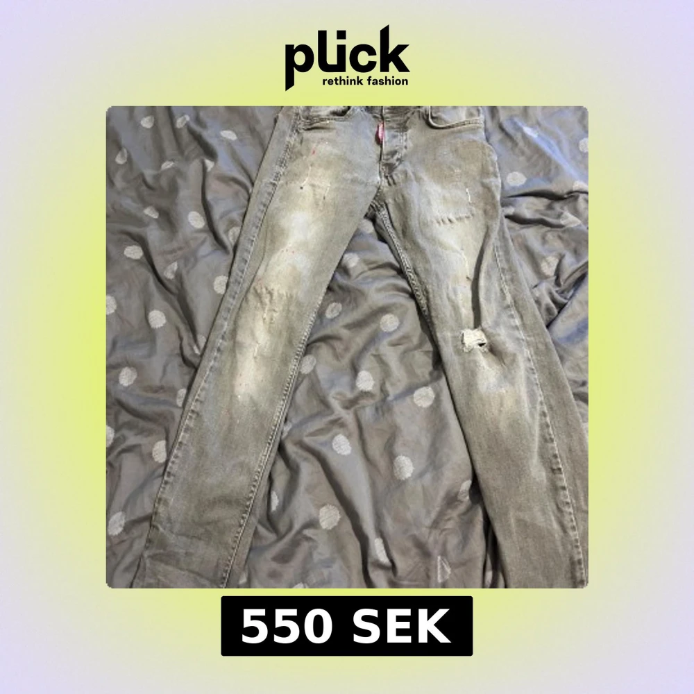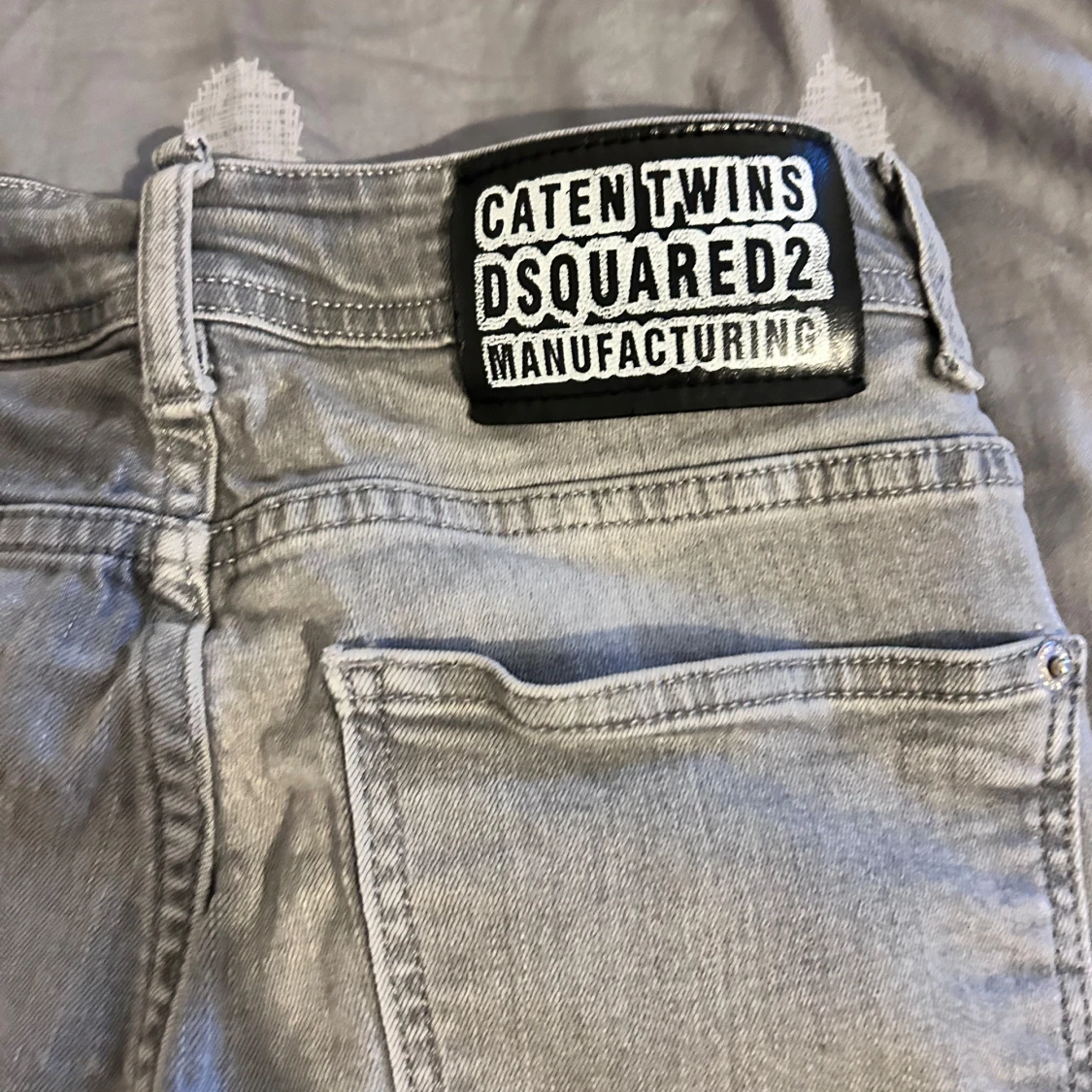 Säljer ett par grå jeans från Dsquared2 med coola slitningar och färgstänk på framsidan. Modellen har en rak passform och klassisk femficksdesign. Jeansens material är bomull och de har en snygg Dsquared2-patch bak i midjan. Perfekt för dig som gillar streetstyle.