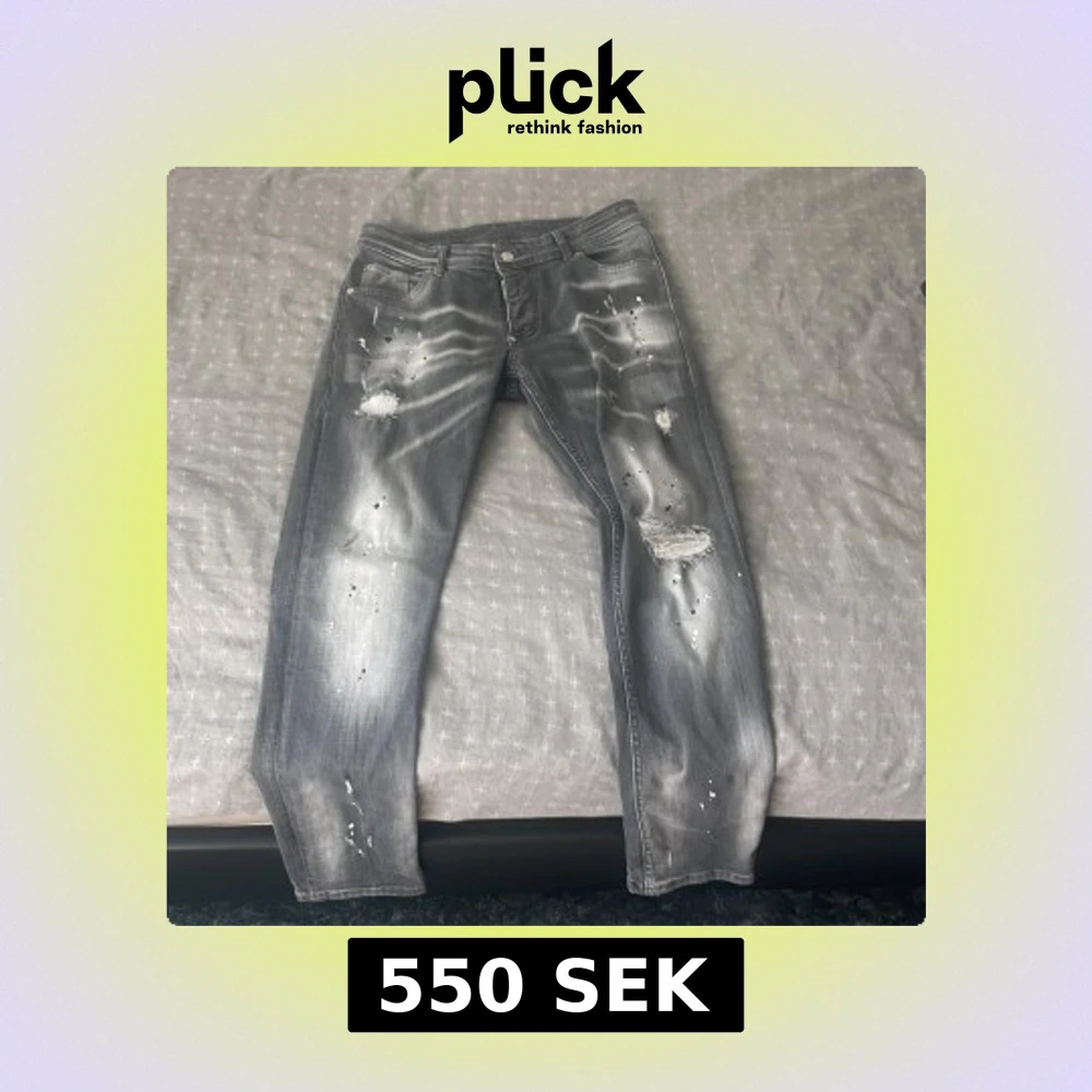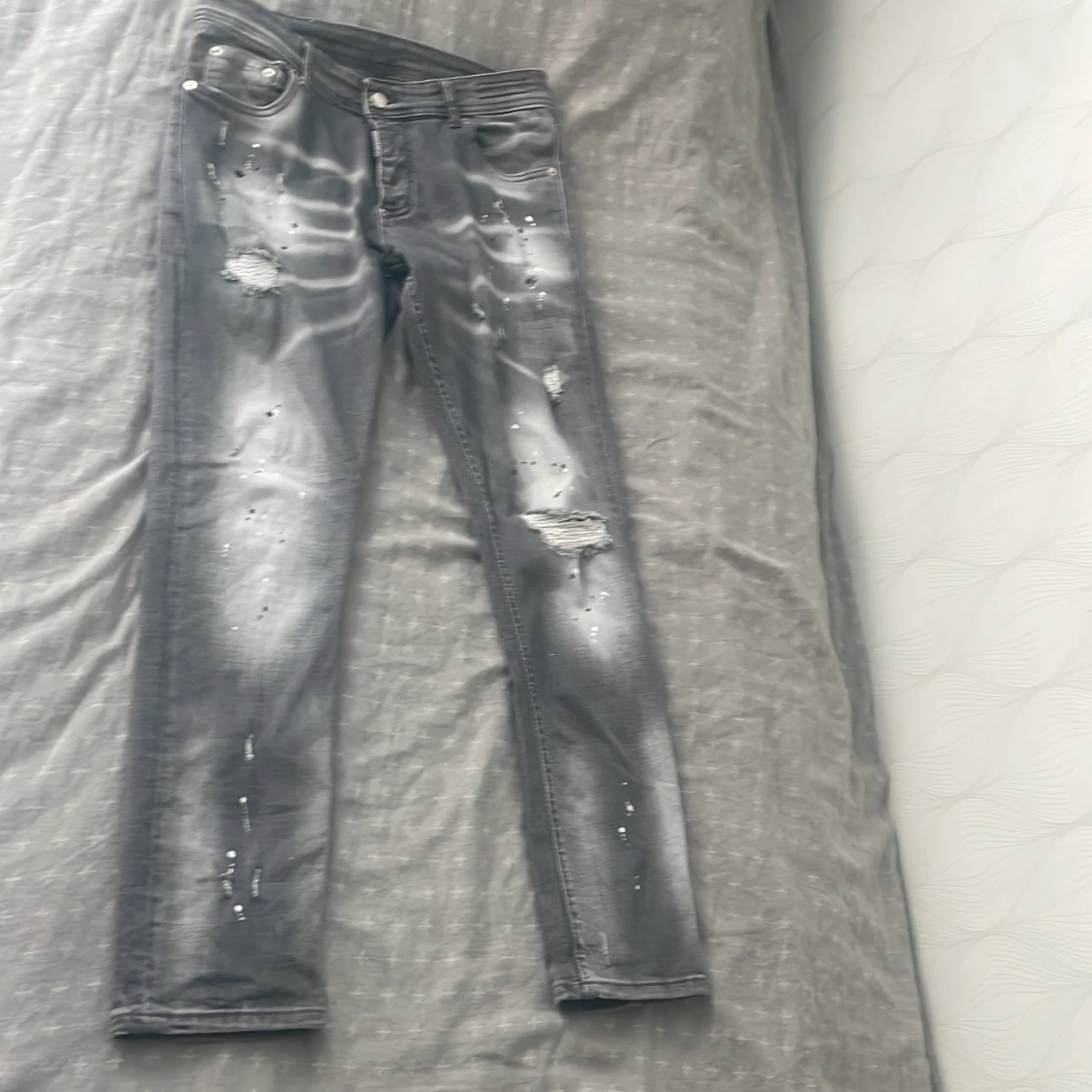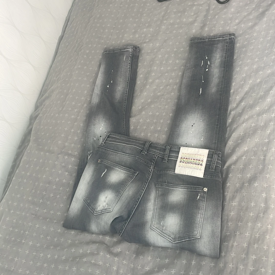 Säljer ett par grå jeans från Dsquared2 med coola slitningar, hål och färgstänk för en edgy look. Jeansen har fem fickor, raka ben och en stor vit Dsquared2-patch bak. Perfekta för dig som gillar streetstyle och vill sticka ut.