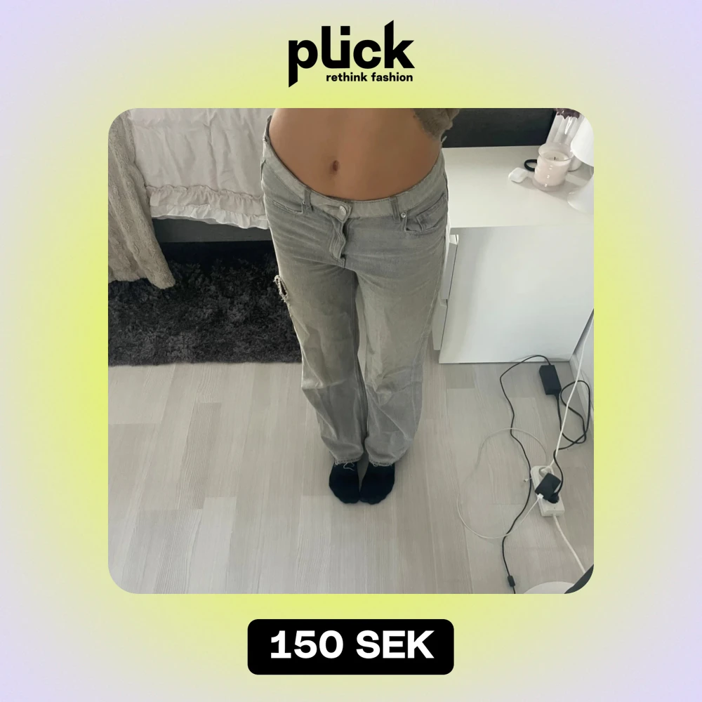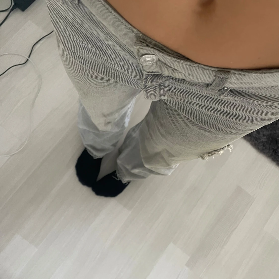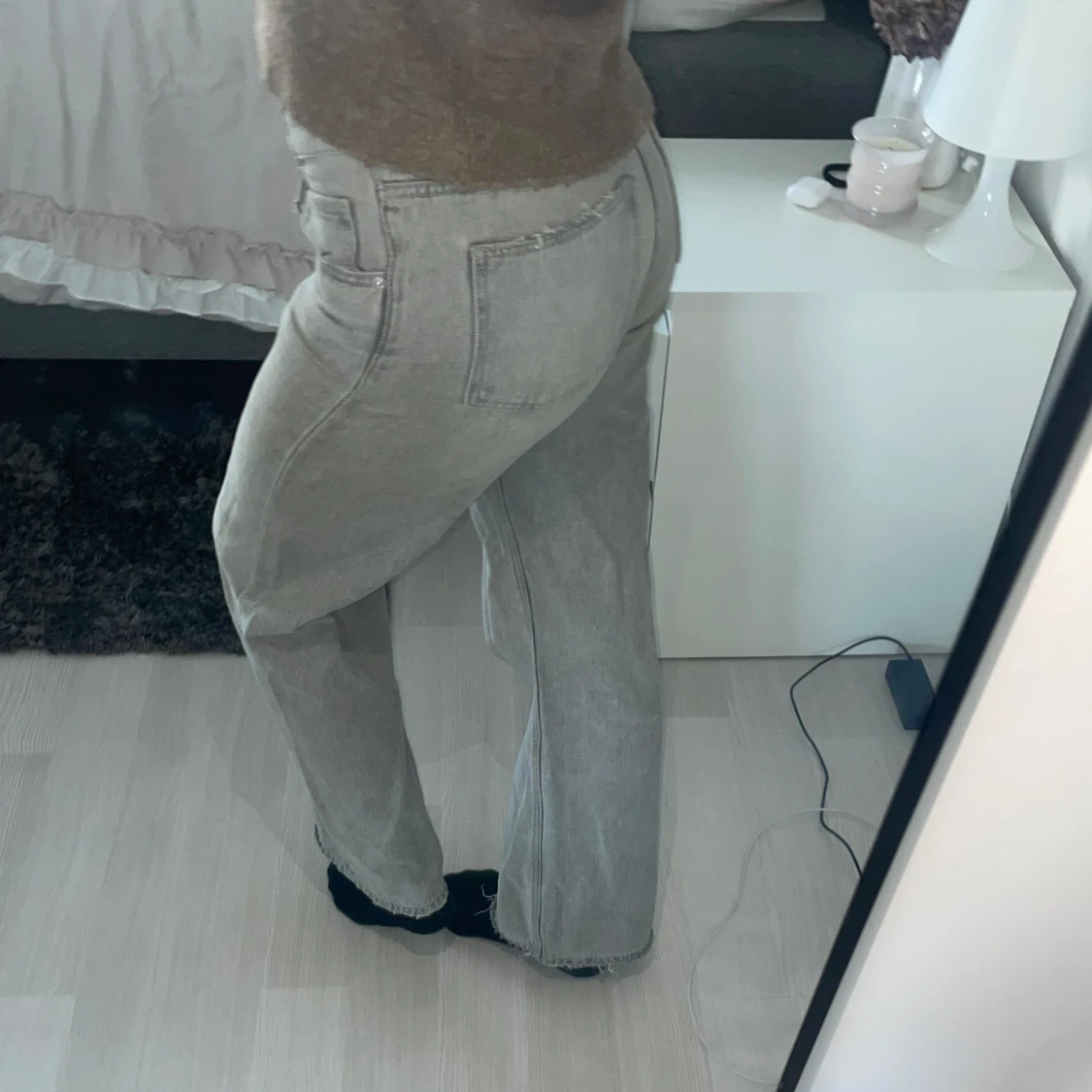 Snygga grå jeans med vida ben och låg midja från Gina Tricot. Perfekta för en avslappnad stil. De har en klassisk femficksdesign och knappar framtill.