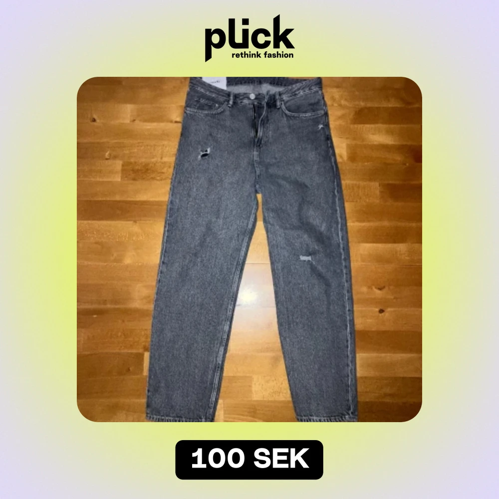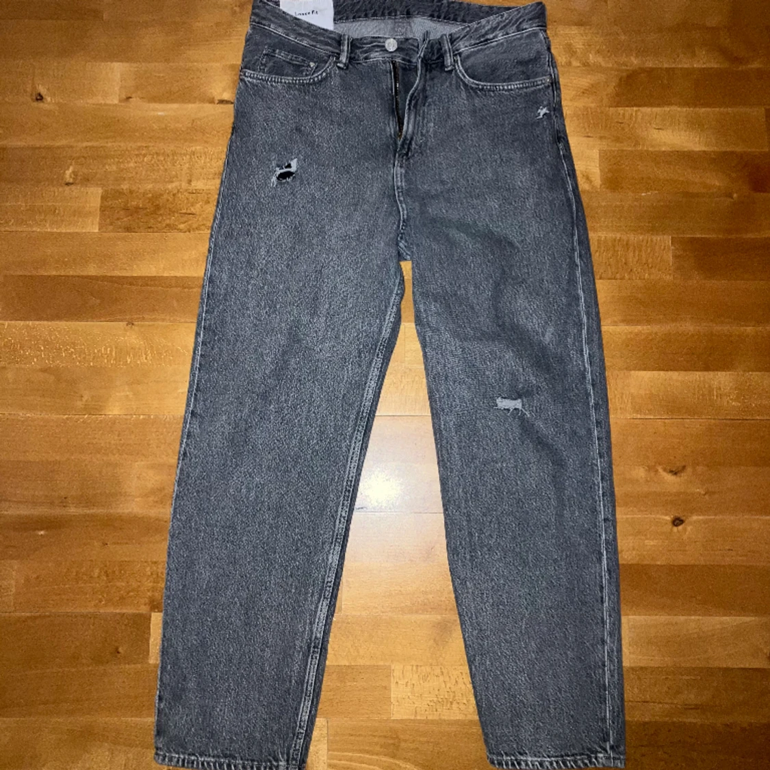 Gråa loose fit jeans från H&M med slitningar som kom med byxan. Köptes för ca 1 år sen och har använts några gånger men är i bra skick! Stl 31x32
