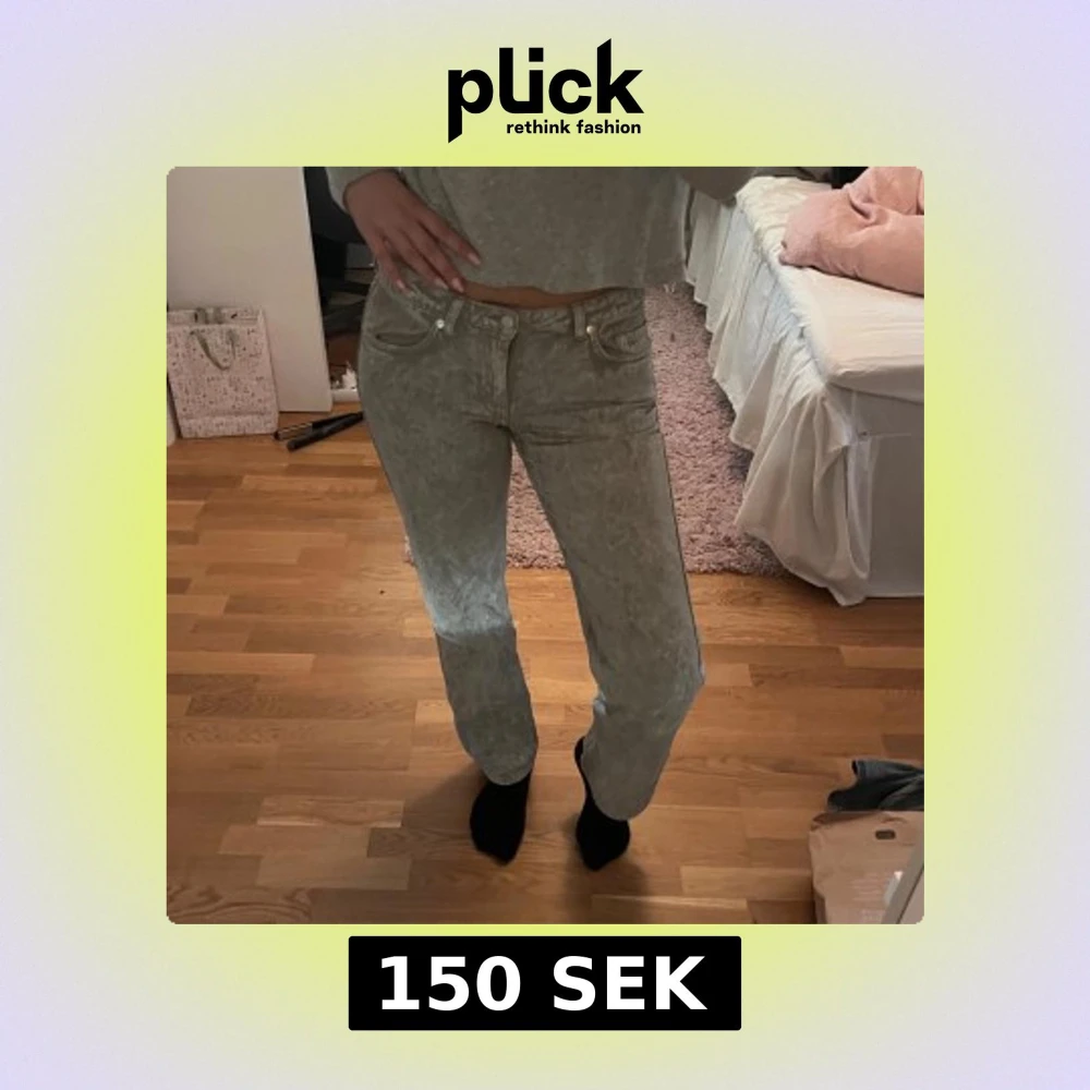 Säljer ett par grå lågmidjade jeans med raka ben. De är i storleken W28 L32 och de är från weekday💕
