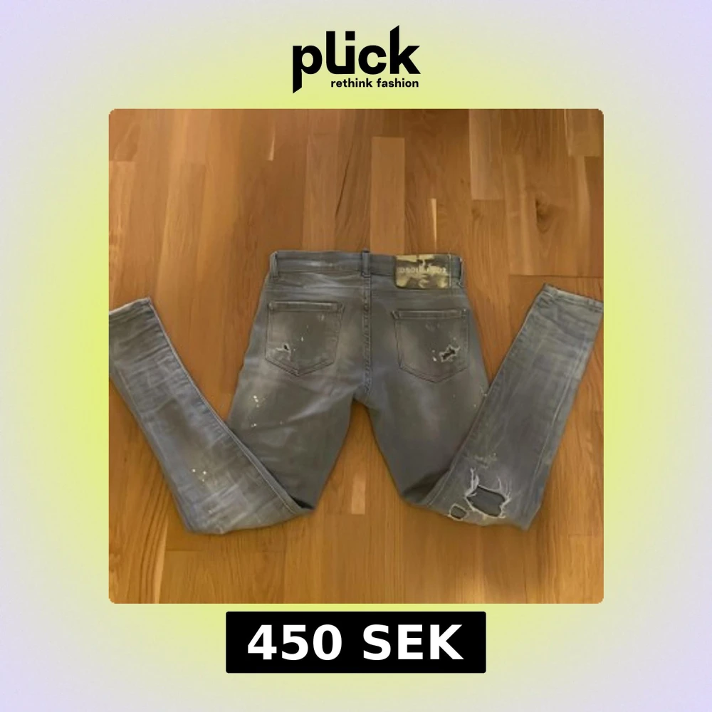 Säljer ett par grå jeans från Dsquared2 med slitningar, hål och färgstänk för en riktigt edgy look. Jeansen har klassisk femficksdesign, låg midja och Dsquared2-logga på bakfickan och vid gylfen. Perfekta för dig som gillar streetstyle och detaljer.