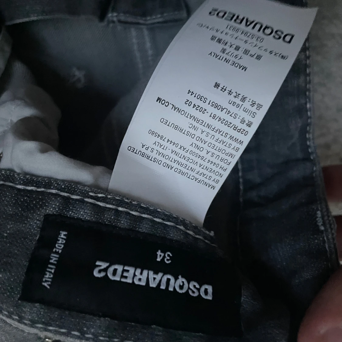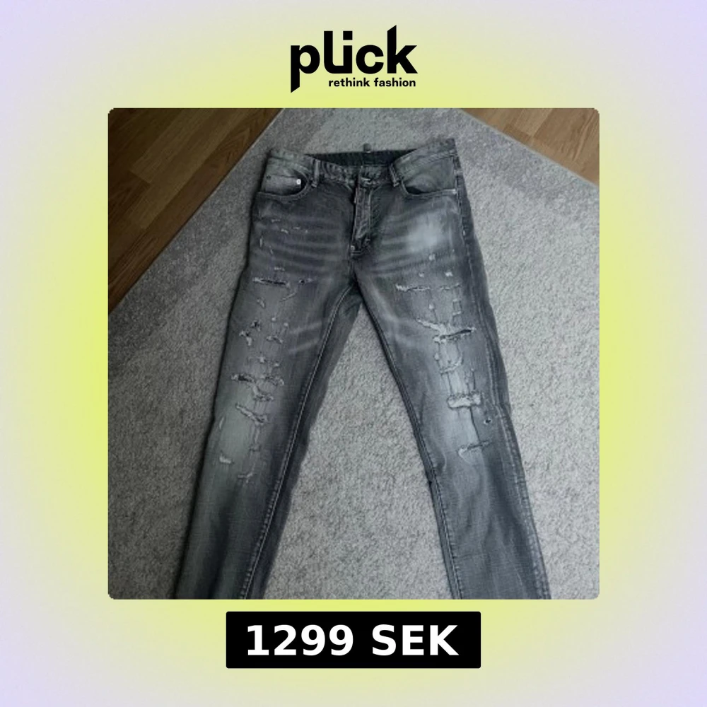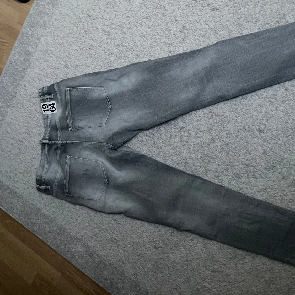 Säljer ett par grå jeans från Dsquared2 med slitna detaljer och snyggt tvättad look. Byxorna har fem fickor, smal passform och klassisk knappgylf. Perfekta för dig som gillar streetstyle och vill sticka ut lite extra.