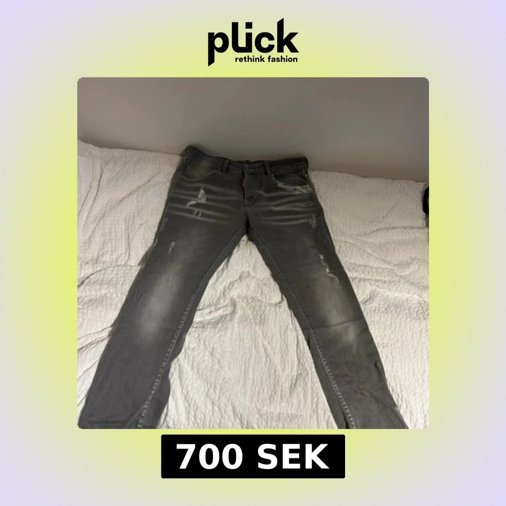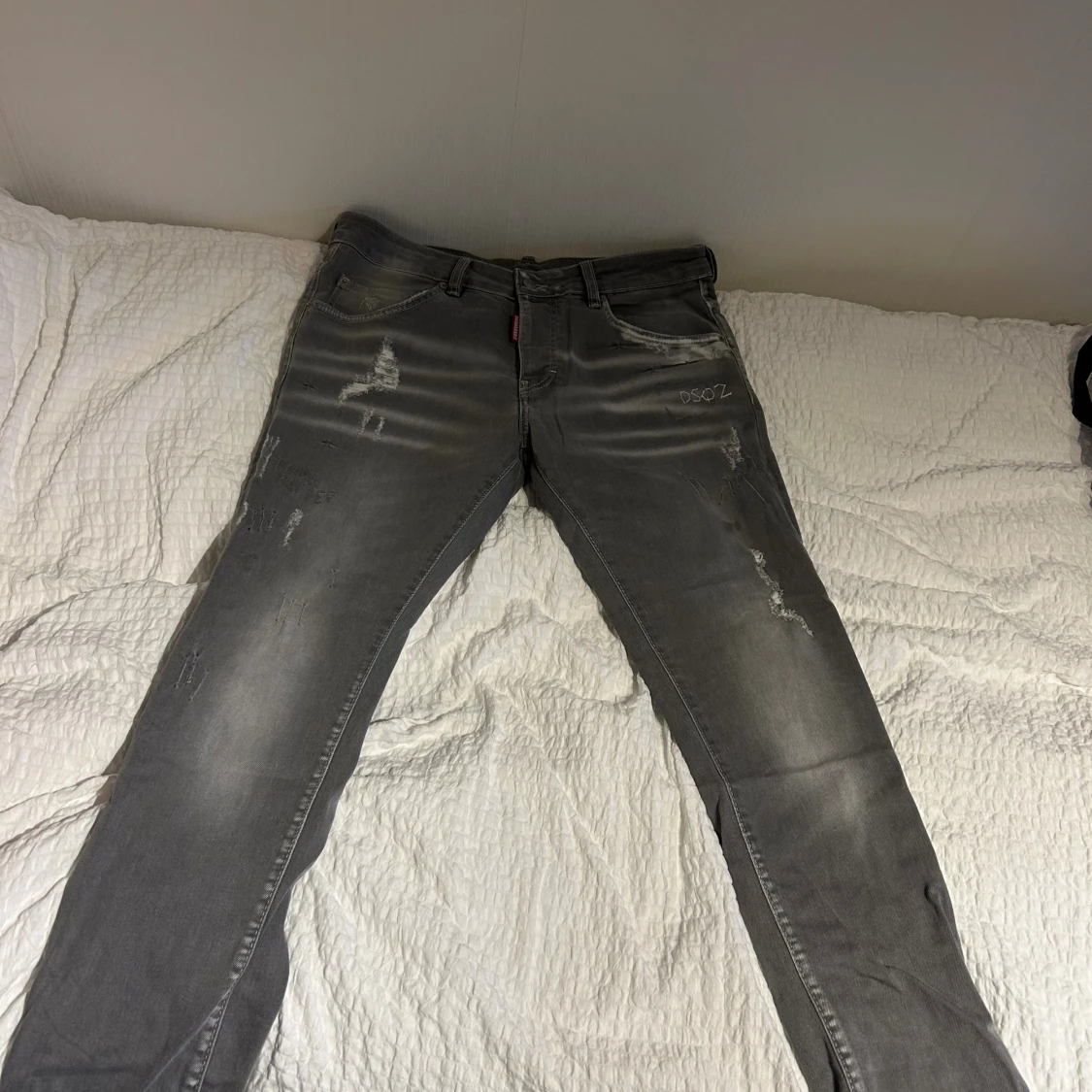 Säljer ett par grå jeans från Dsquared2 i storlek 50. Byxorna har slitna detaljer och en snygg tvättad look. Klassisk femficksmodell med DSQ2-logga bak i midjan. Jeansen är raka och har en modern passform som sitter snyggt på benen.