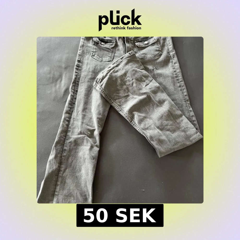 Snygga grå jeans från Gina Tricot i en klassisk stil. De är bootcut och är perfekta för en avslappnad look. Jeansen har fickor både fram och bak samt knapp och dragkedja i gylfen. Fickorna där fram har väldigt fina knappar med silver färgad metal, jeansen har bara används ett fåtal gånger.