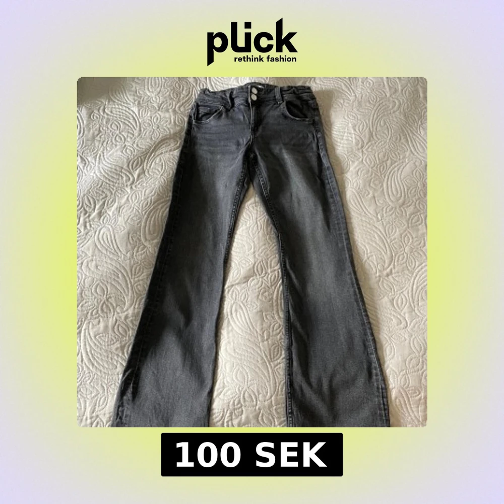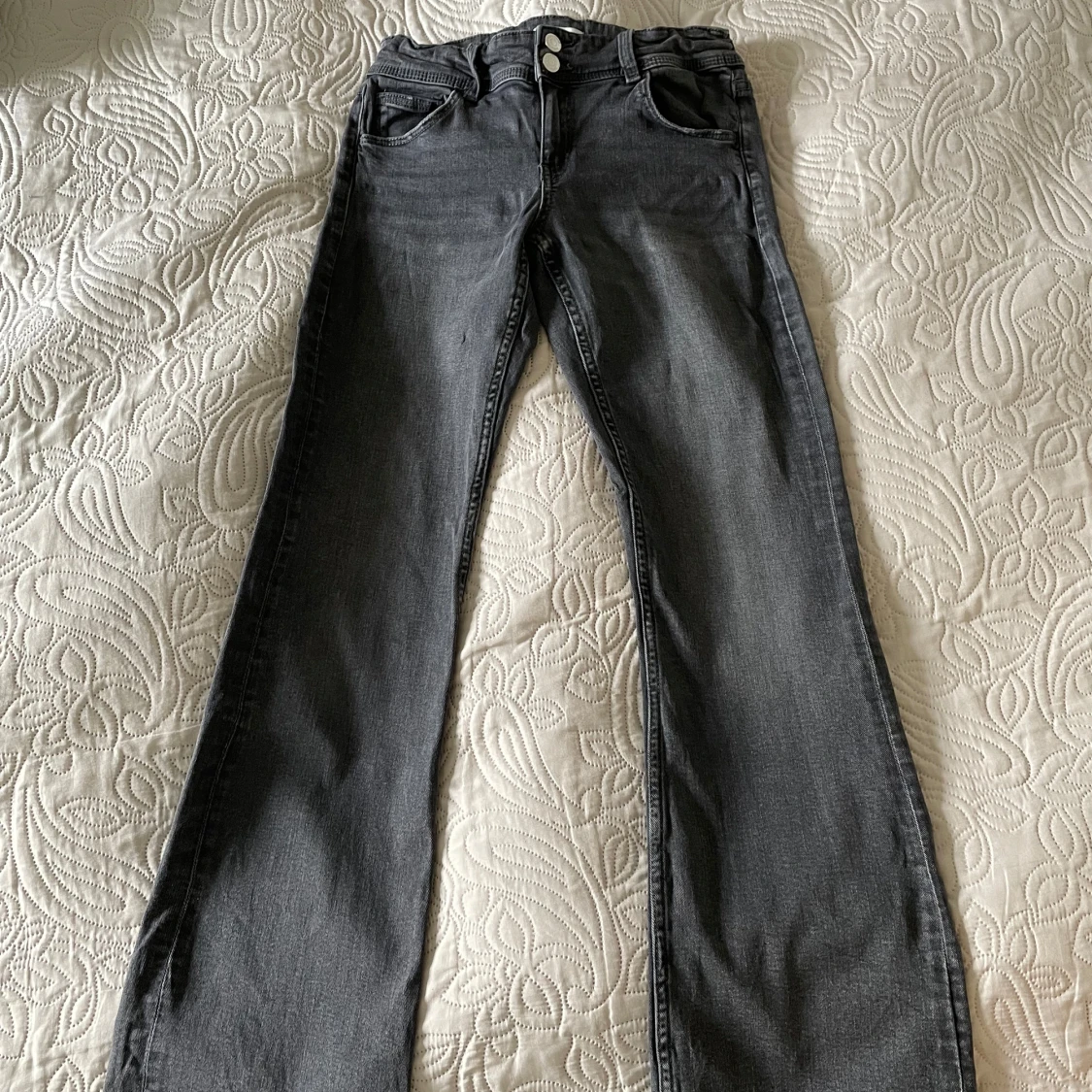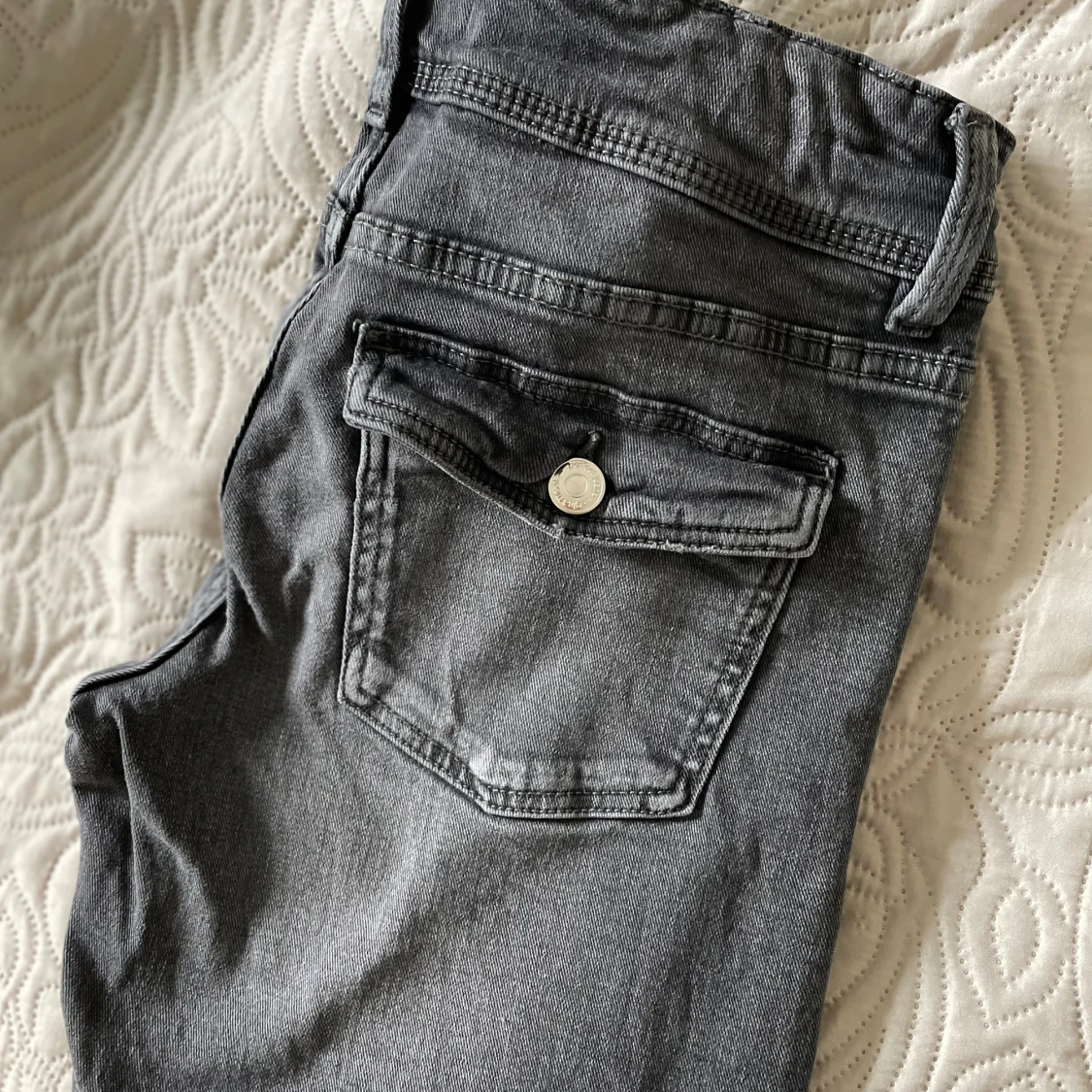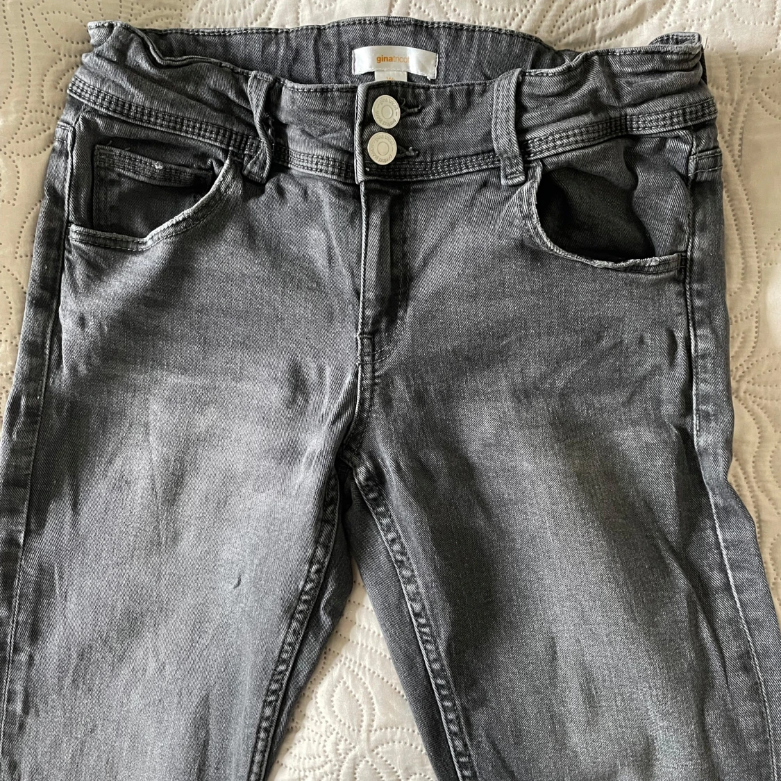 Snygga grå jeans från Gina Tricot med hög midja och raka ben. Byxorna har två knappar och dragkedja framtill samt fickor både fram och bak. Perfekta för en stilren look.