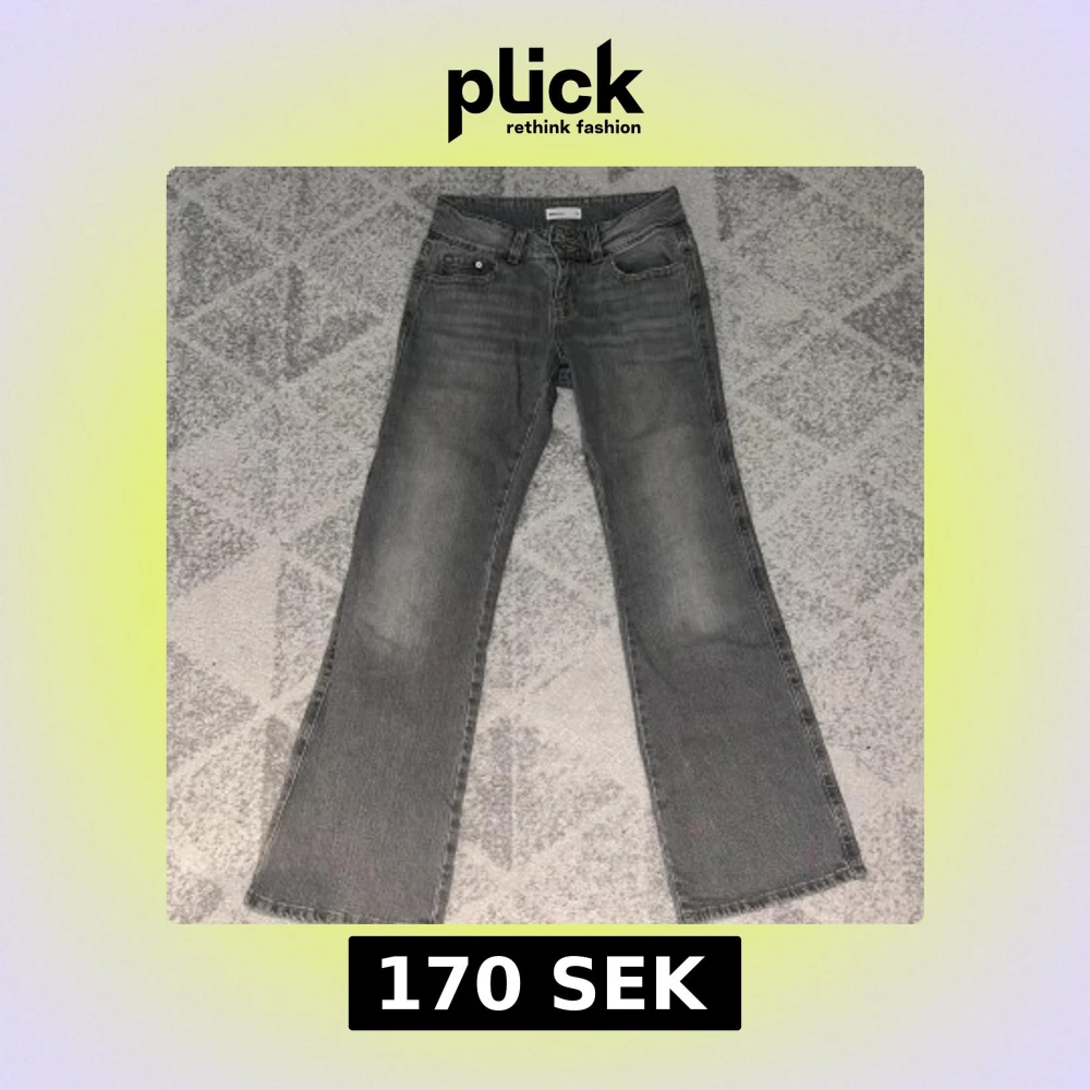 Snygga grå jeans från Gina tricot i rak modell med klassiska fem fickor och dubbla knappar i midjan. Jeansen har en tvättad look och raka ben, perfekt för en avslappnad stil. Materialet är mjukt denim och färgen är en cool, lite sliten grå.