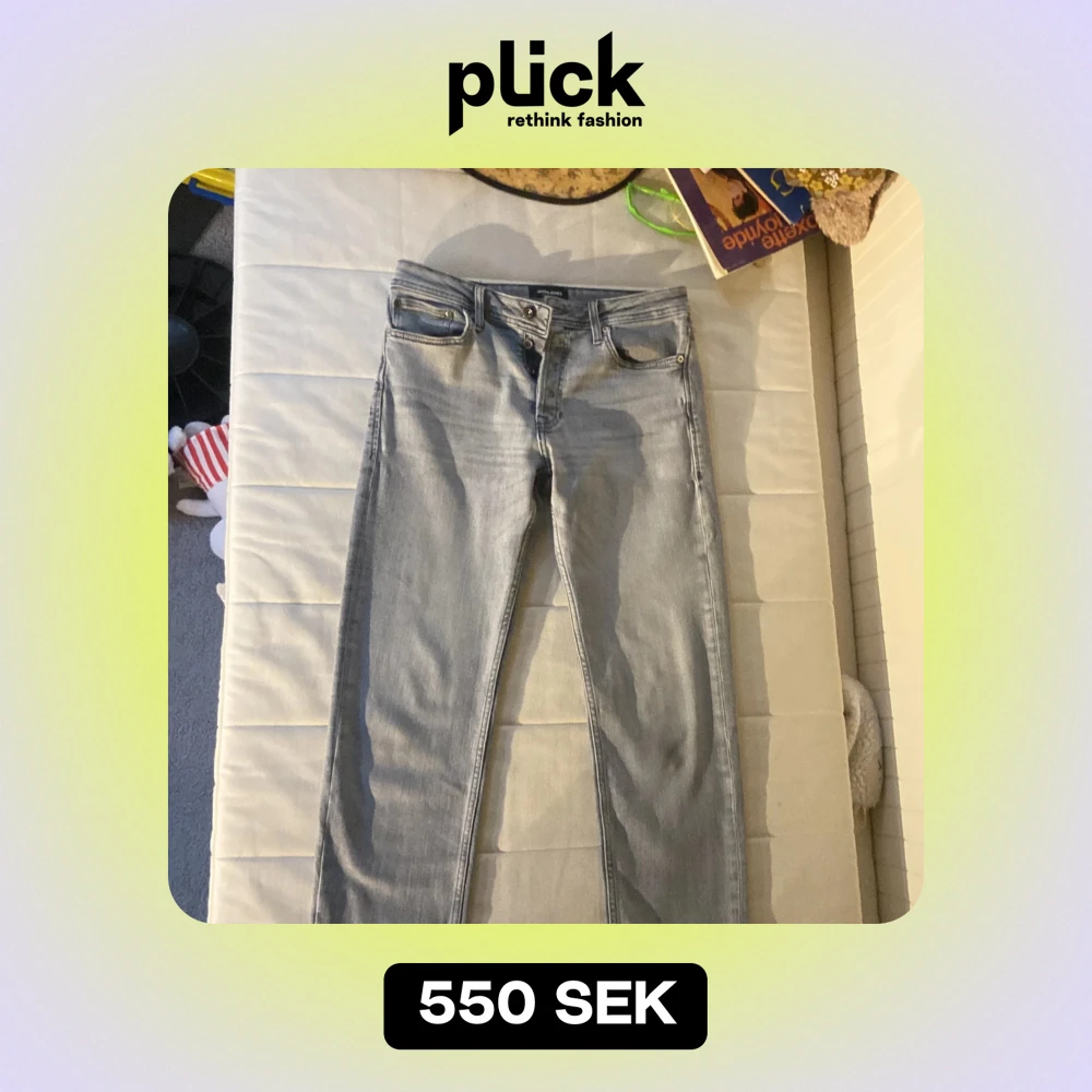 Säljer ett par snygga grå jeans från Jack & Jones. De har en klassisk femficksdesign och är i väldigt bra skick. Perfekta för både vardag och fest! Passformen är straight och de har en knappgylf. Bälte ingår för 100kr extra.