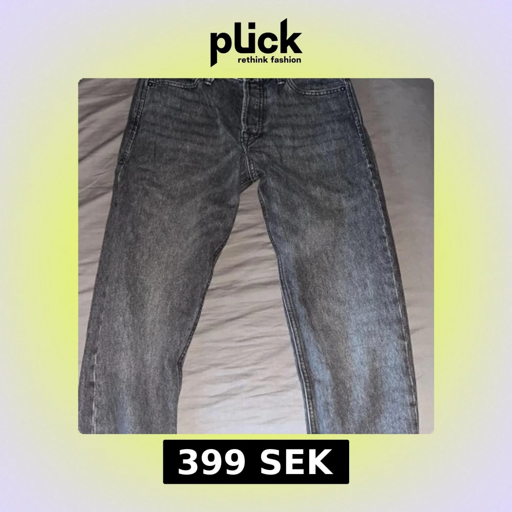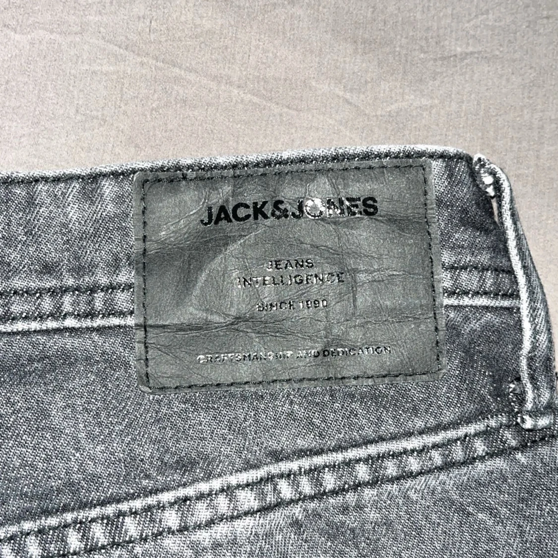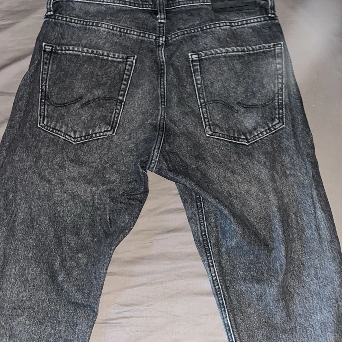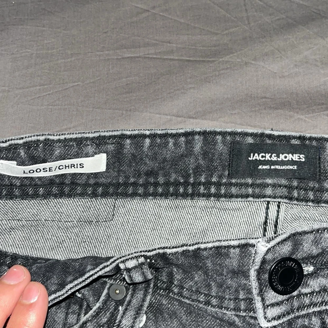 Säljer ett par grå jeans från Jack & Jones i modellen Loose/Chris. De har en loose passform och är tillverkade i denim. Klassisk femficksdesign med knappgylf och bälteshällor. Knappt använda