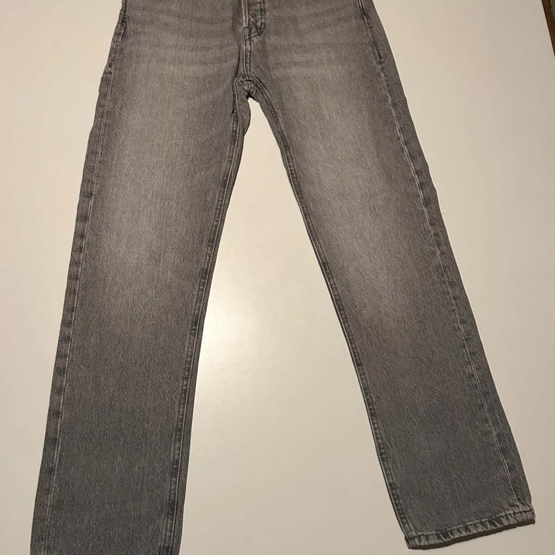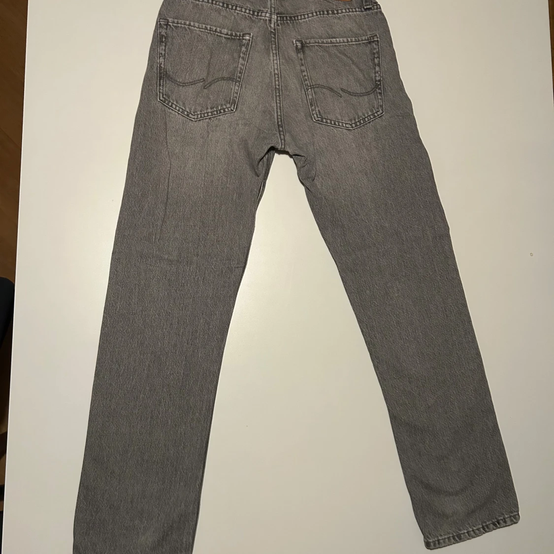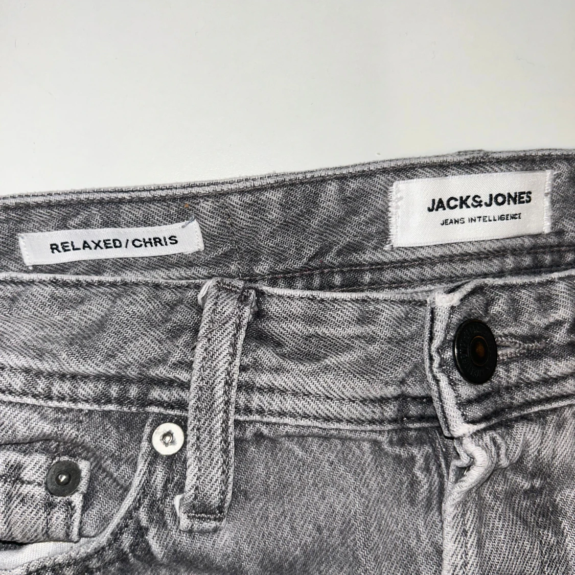 Snygga grå jeans från Jack & Jones, modell Relaxed/Chris. De har en avslappnad passform med raka ben och klassisk femficksdesign. Jeansen är tillverkade i mjukt denim och har en cool tvättad look med svarta detaljer vid knapparna.