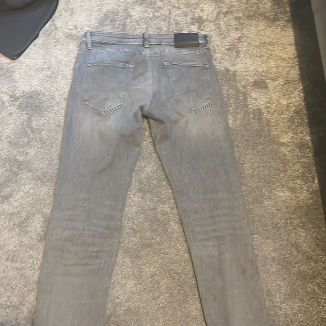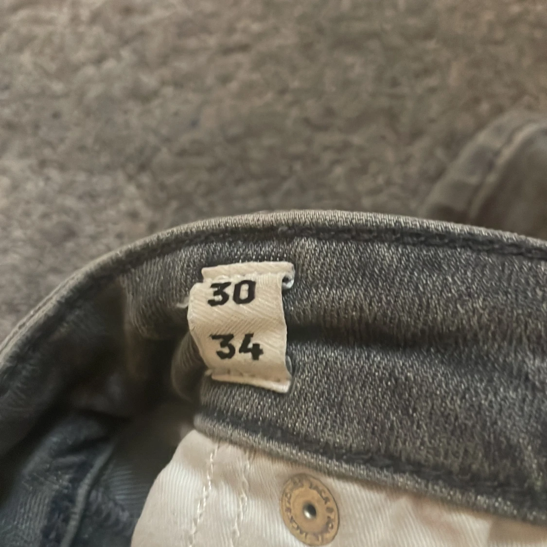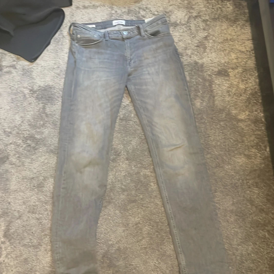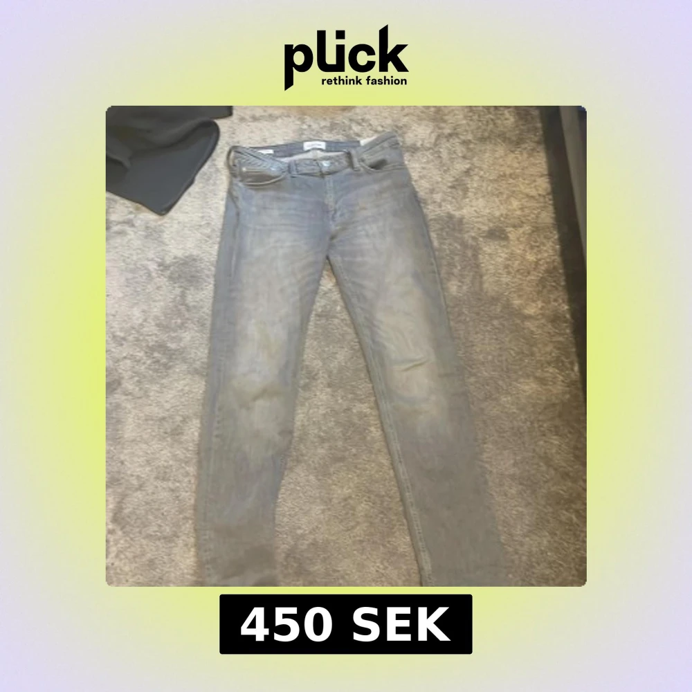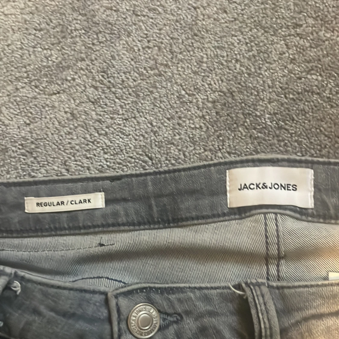 Säljer ett par grå jeans från Jack & Jones, modell Regular/Clark. De har en klassisk femficksdesign och en knappgylf. Perfekta för en avslappnad stil. Bra skick, inte så använd, storlek 30 Bredd 34 längd.