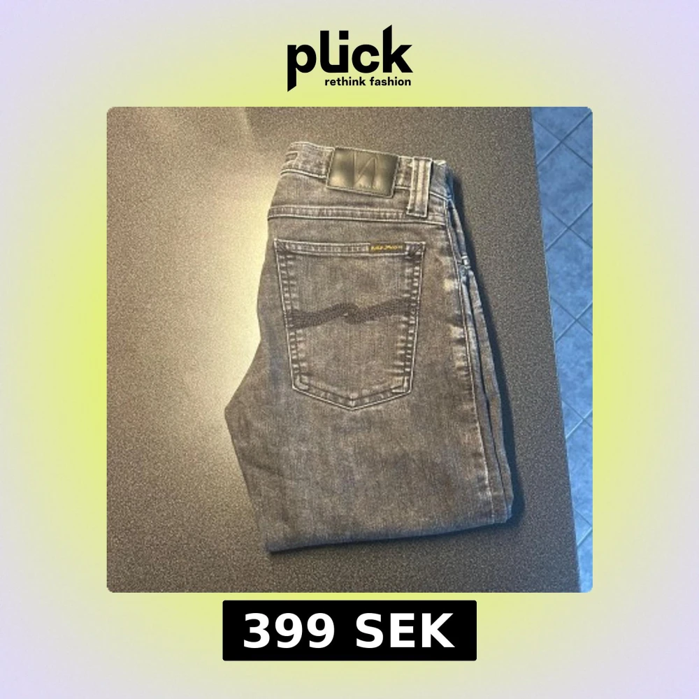 Säljer ett par grå skinny jeans från Nudie Jeans med klassisk femficksdesign och svarta detaljer. Jeansen har en smal passform och är tillverkade i stretchigt denim för extra komfort.