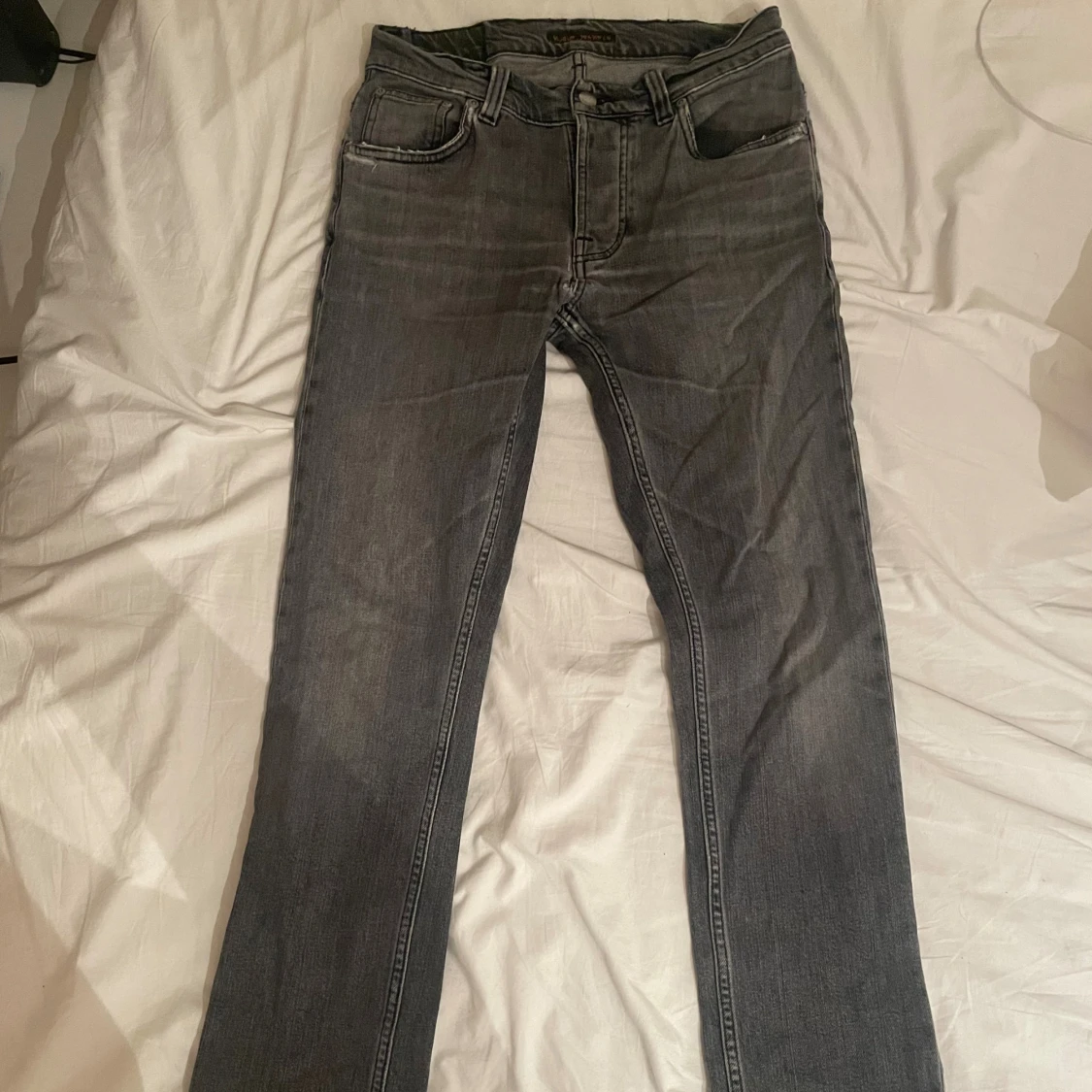 Snygga grå jeans från Nudie Jeans med klassisk svart broderad våg på bakfickorna. Jeansen har fem fickor, raka ben och normal passform. Tillverkade i mjukt denimtyg som ger en avslappnad vibe. Perfekta för dig som gillar stilrena och tidlösa jeans.