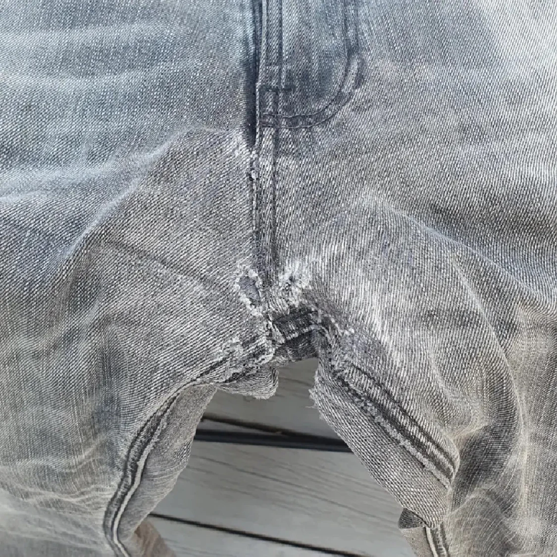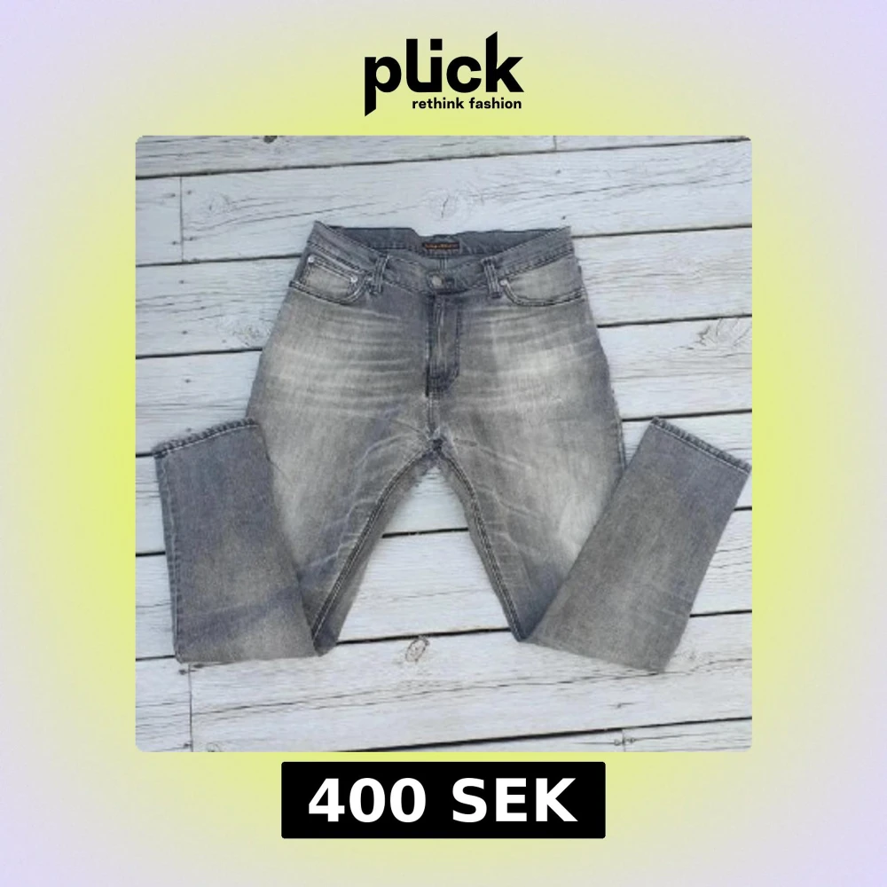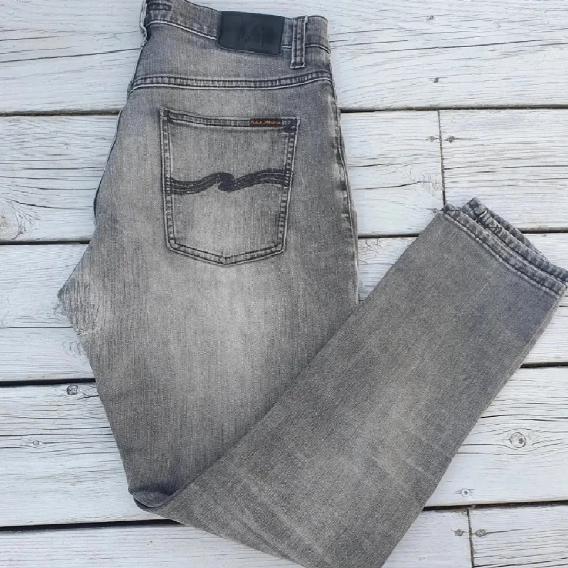 Snygga grå jeans från Nudie Jeans med slitna detaljer och klassisk femficksdesign. Jeansen har en rak passform och är tillverkade i mjukt denimtyg. Bakfickan har Nudie Jeans ikoniska broderi. Perfekt för en avslappnad streetstil. W30 L30
