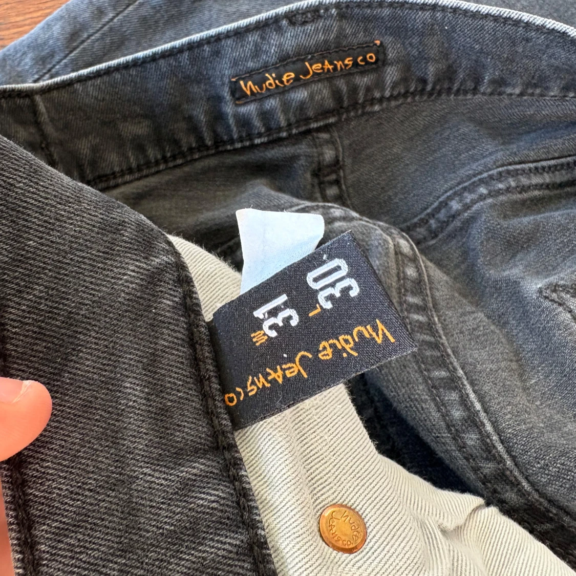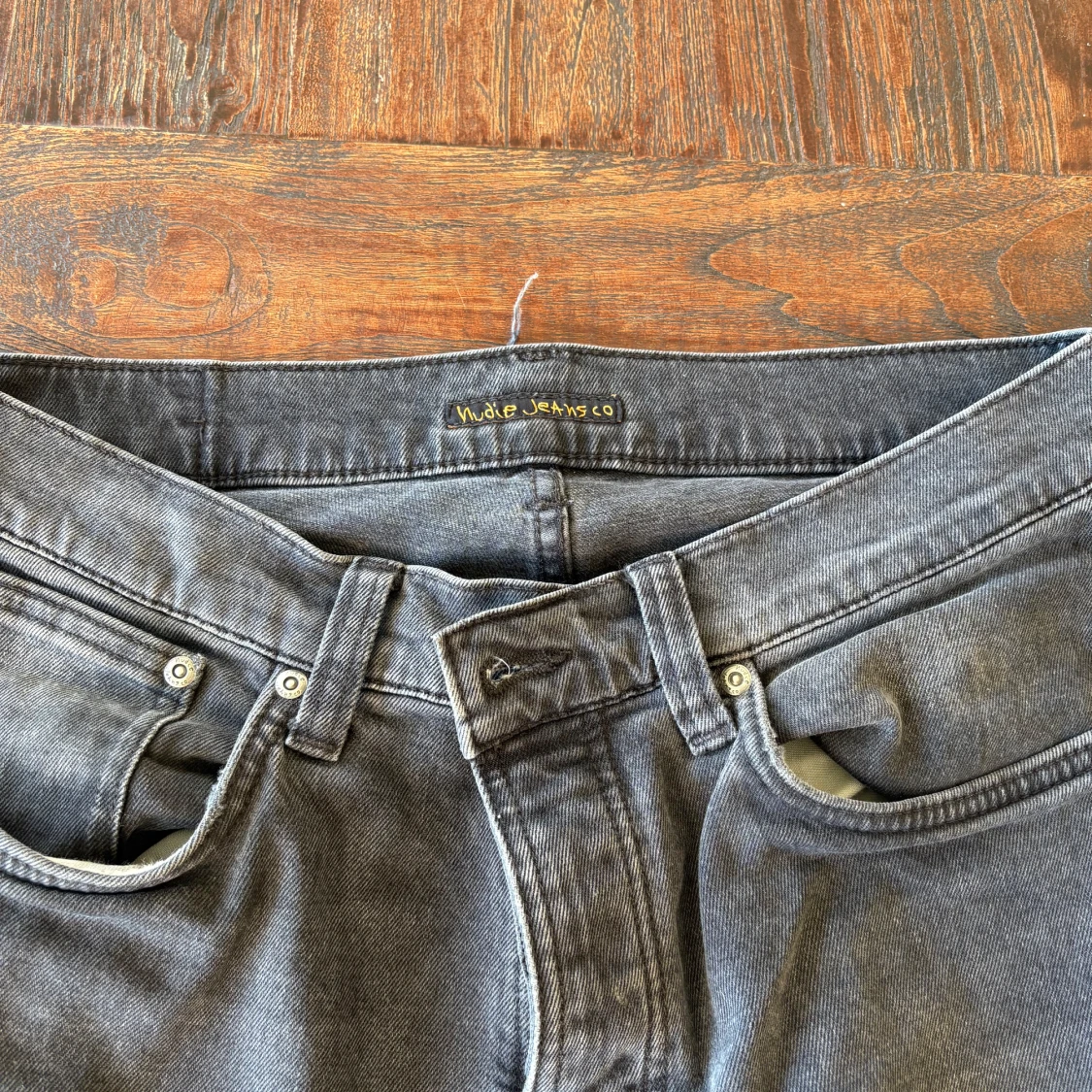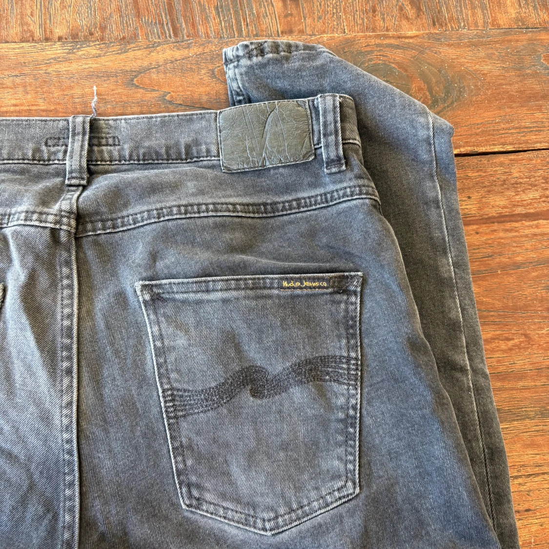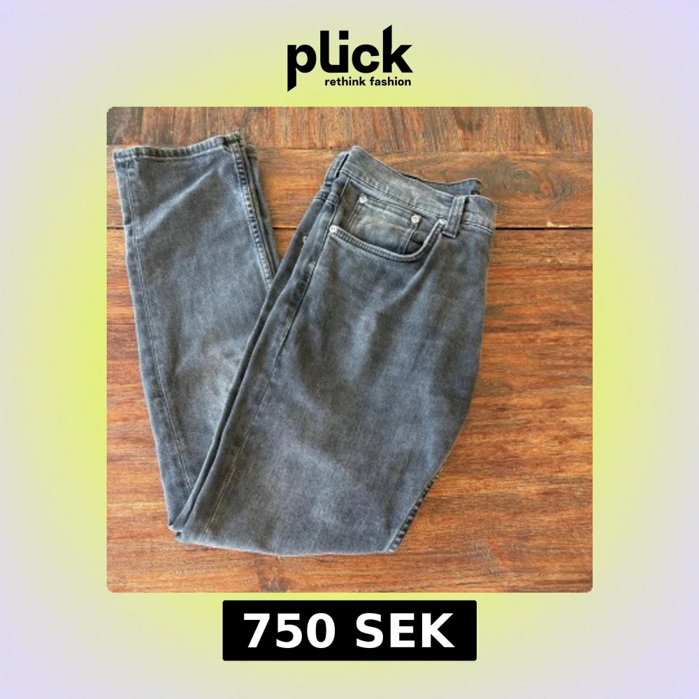 Säljer ett par grå jeans från Nudie Jeans med klassisk femficksdesign och diskret broderad bakficka. Jeansen har normal passform och raka ben, tillverkade i mjuk bomullsdenim. Perfekta för dig som gillar stilrena och avslappnade vibes.