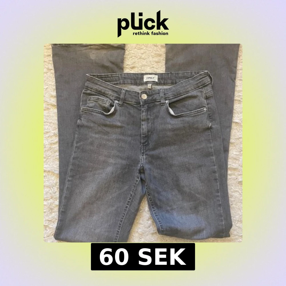 Snygga grå flare jeans från ONLY med klassisk femficksdesign. Jeansen har normal passform och är tillverkade i mjukt denimtyg. De är välanvända, man kan se det på slutet av jeansen. Men annars är jeansen i bra skick. Säljer dem för att de är för stora.