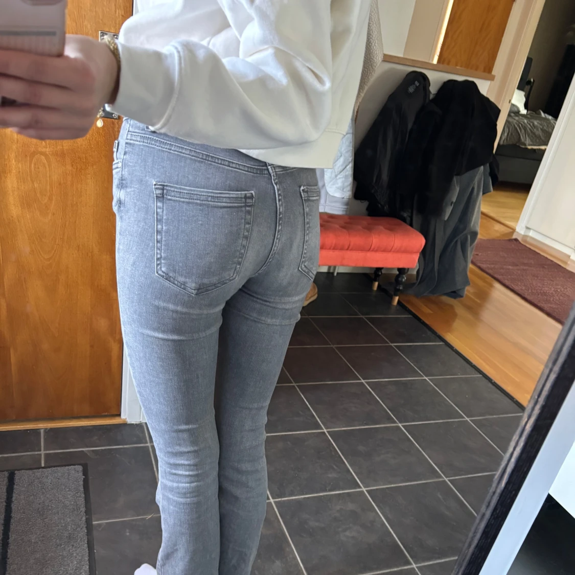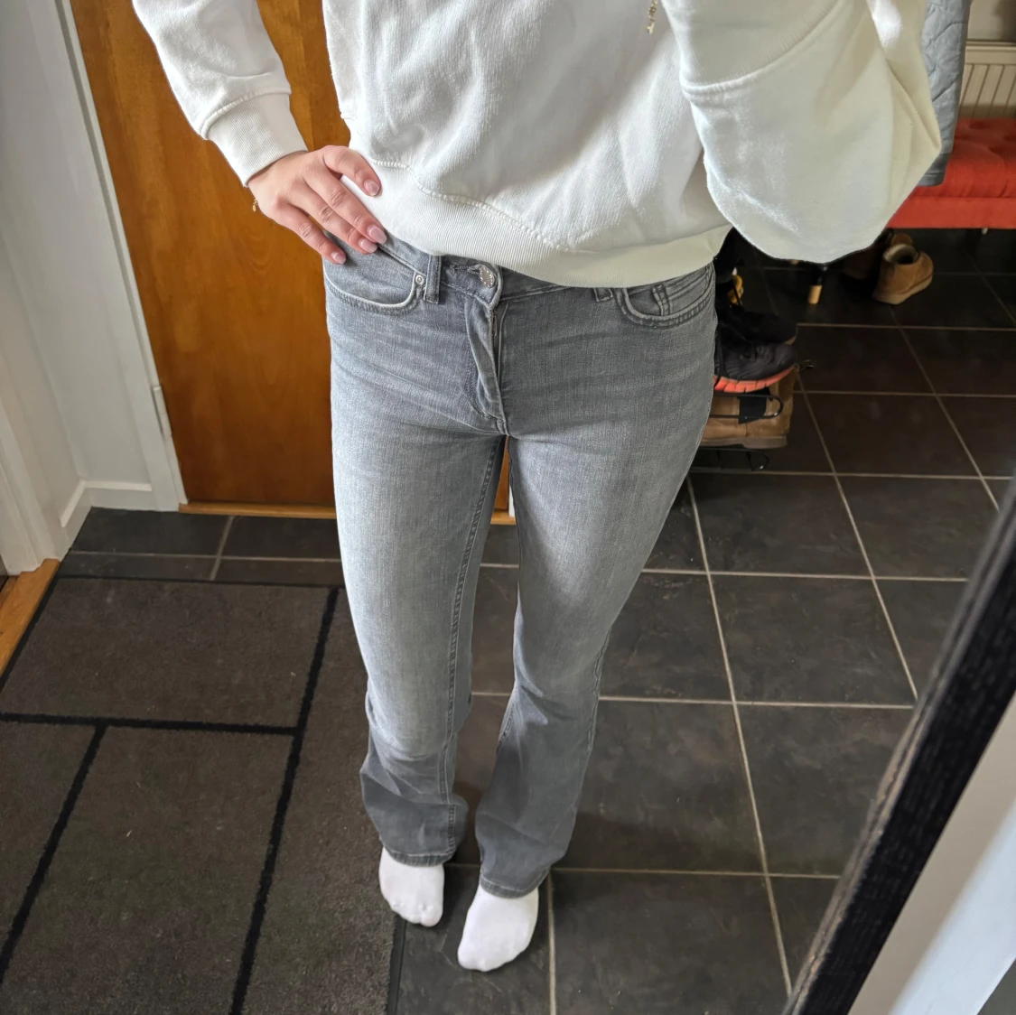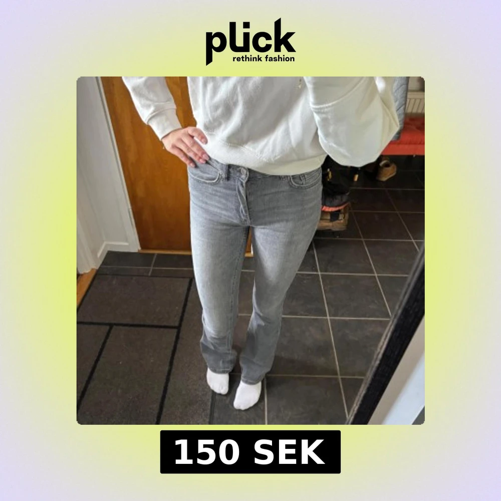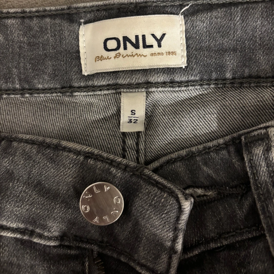 Snygga grå jeans från ONLY. Bootcut i storlek S, längd 32, midwaist. Sparsamt använda!🌟