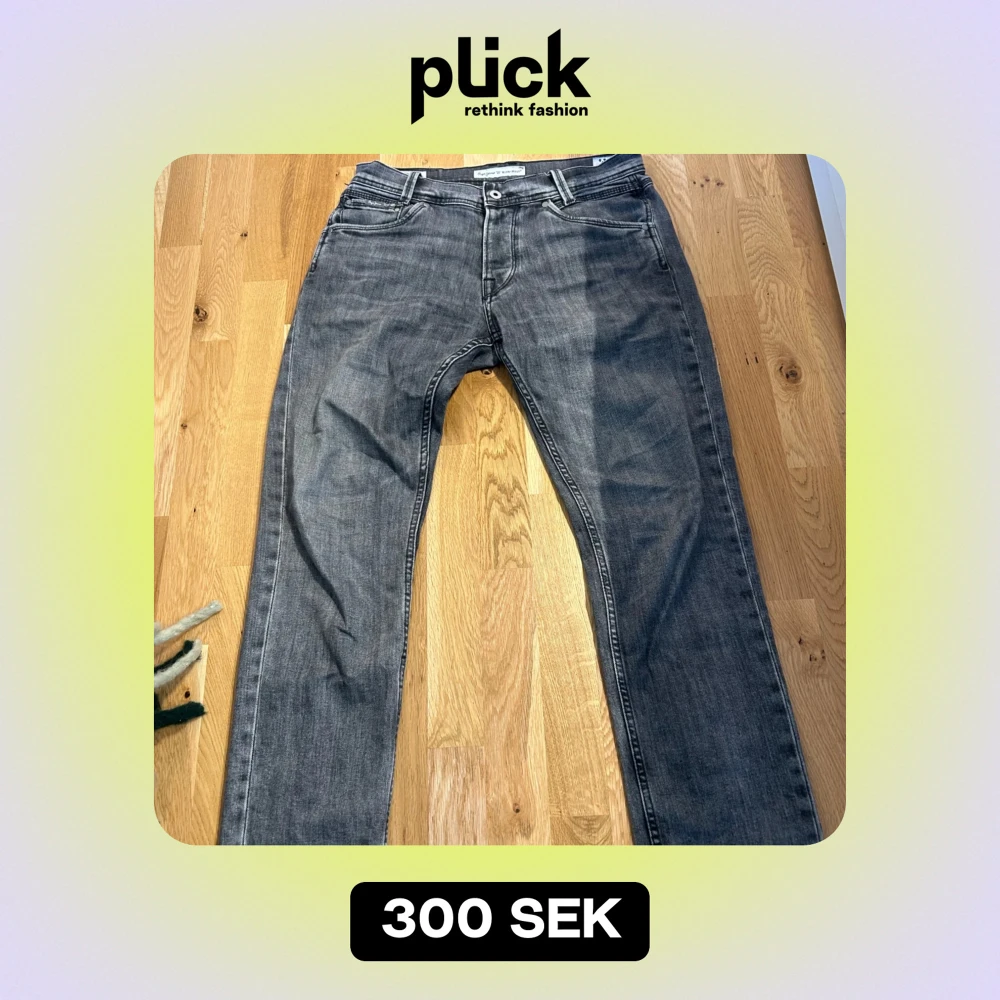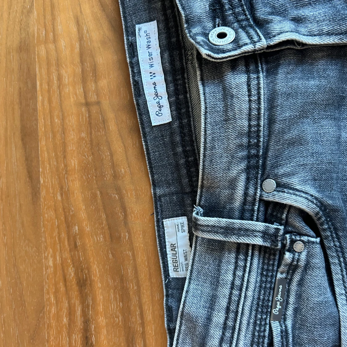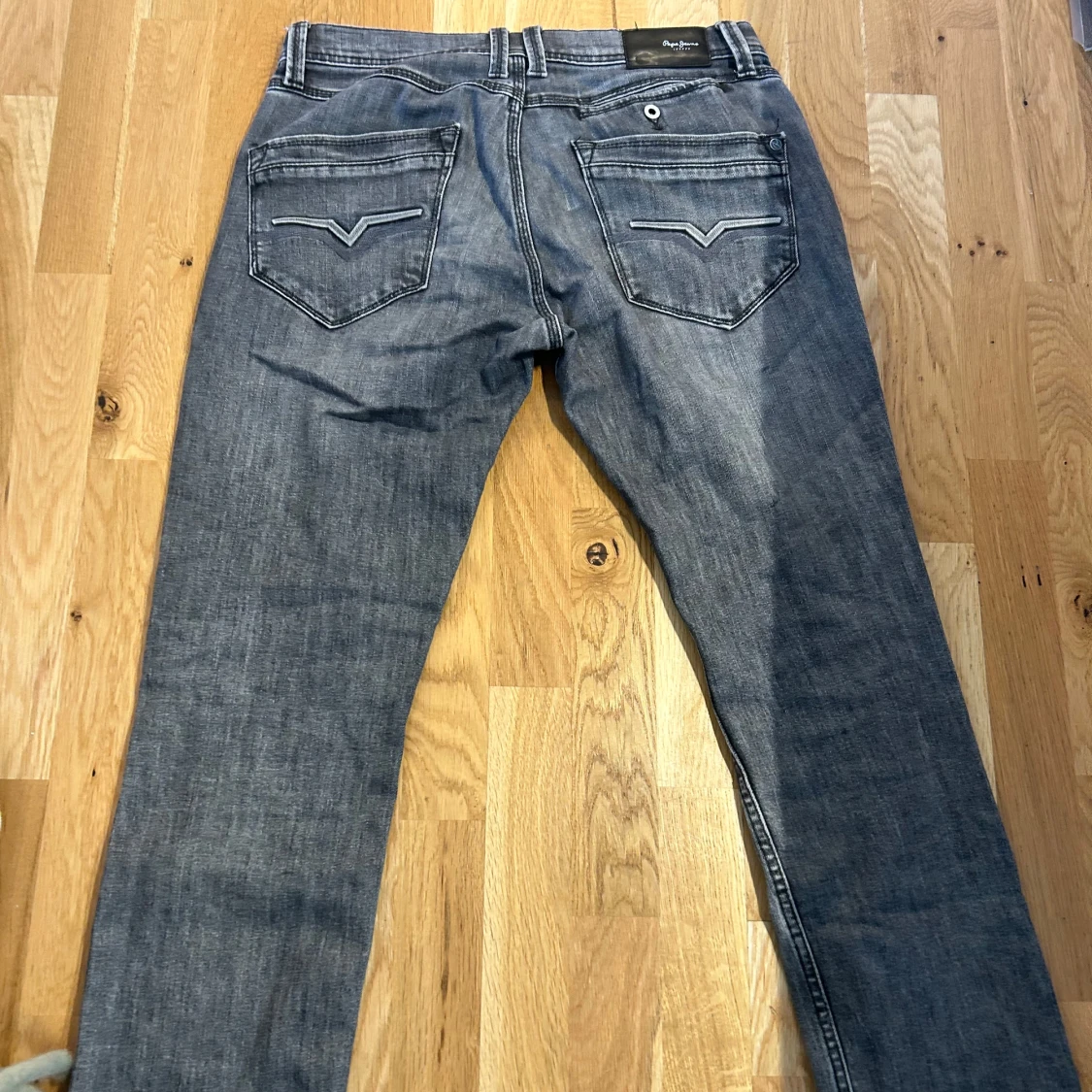 Säljer ett par grå jeans från Pepe Jeans i bra skick. De har en klassisk femficksdesign och en knappgylf. Jeansen är i regular fit och passar perfekt för både vardag och fest. De har snygga detaljer på bakfickorna som ger en extra touch.