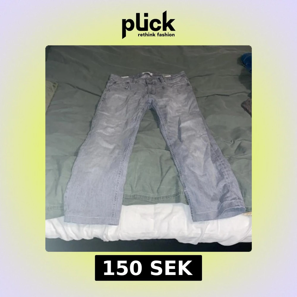 Säljer ett par grå jeans från Regular Clark. De har en klassisk femficksdesign med dragkedja och knapp framtill. Perfekta för en avslappnad stil. Jeansen är insydda vid benen så dem passar folk som är runt 160 cm.