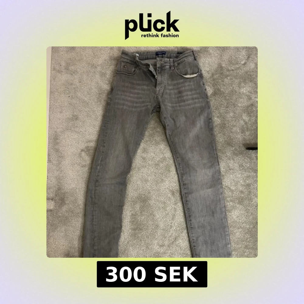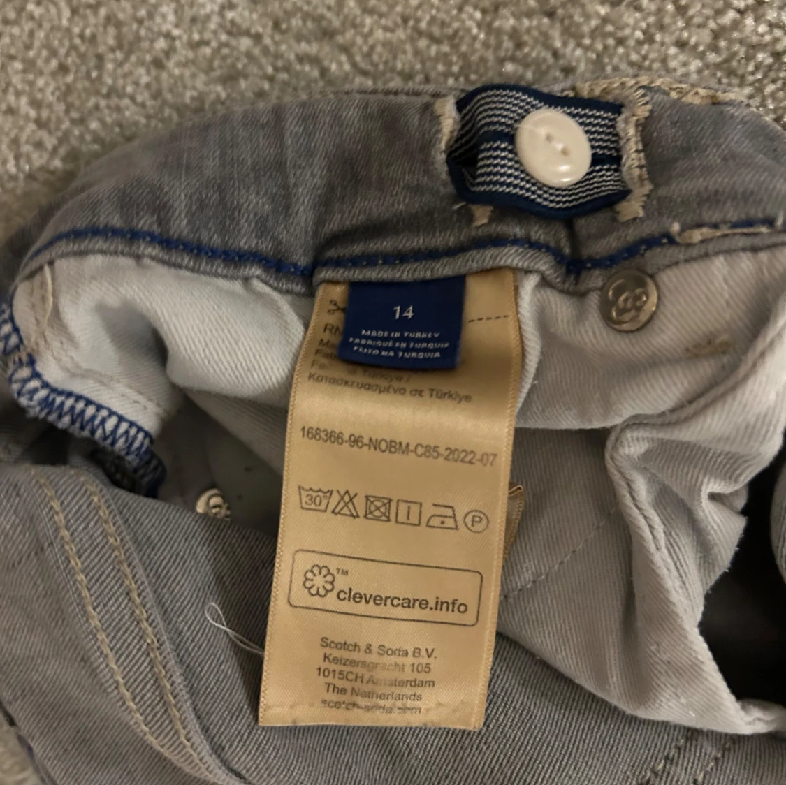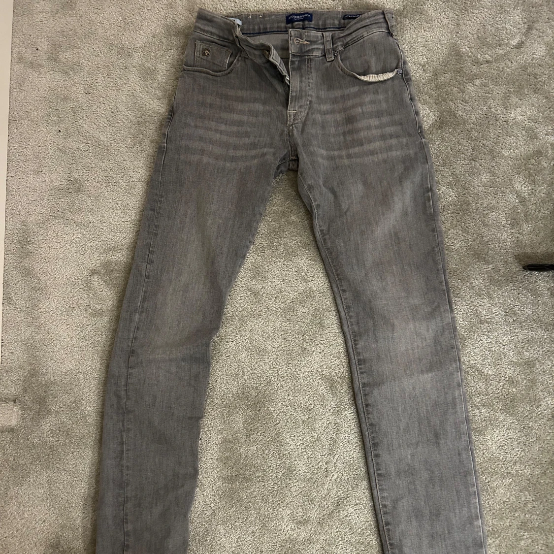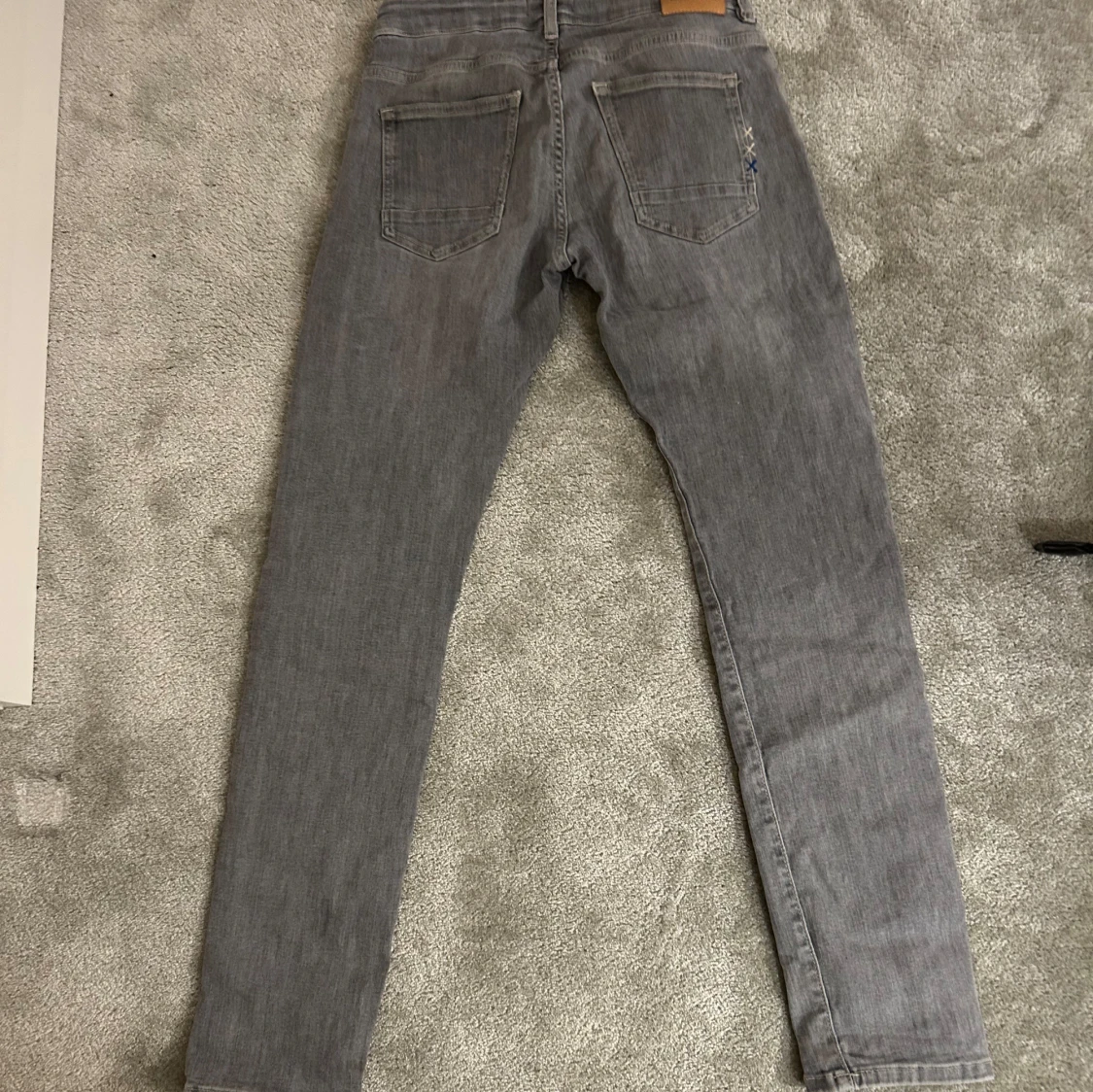 Säljer ett par grå jeans från Scotch & Soda i klassisk femficksmodell. Jeansen har raka ben och normal passform, tillverkade i bomull med snygga detaljer och diskret tvätt. Perfekta för dig som gillar stilrena och enkla jeans. Storlek 14 år.