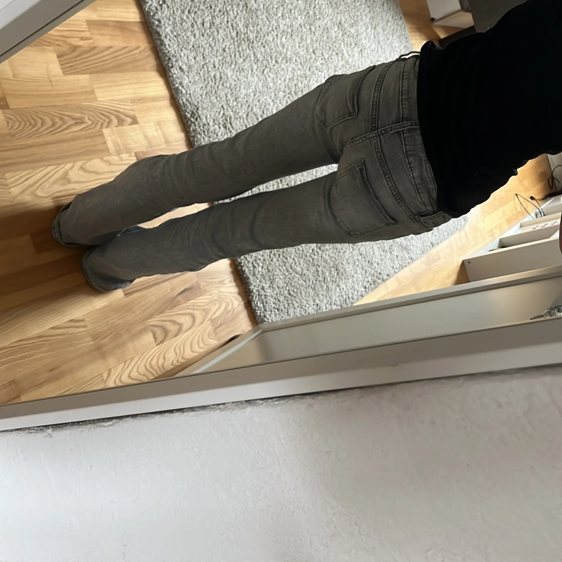 Snygga grå jeans med hög midja och bootcut-stil. De har en unik knappdetalj framtill och är perfekta för en trendig look. Passar bra till både vardag och speciella tillfällen.Grå jeans från Gina tricot i strl 146 tall, de är insydda i låren.