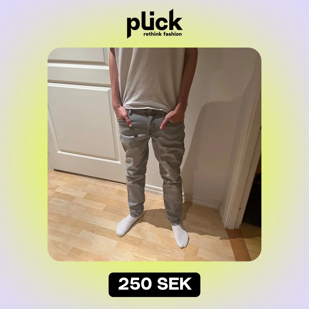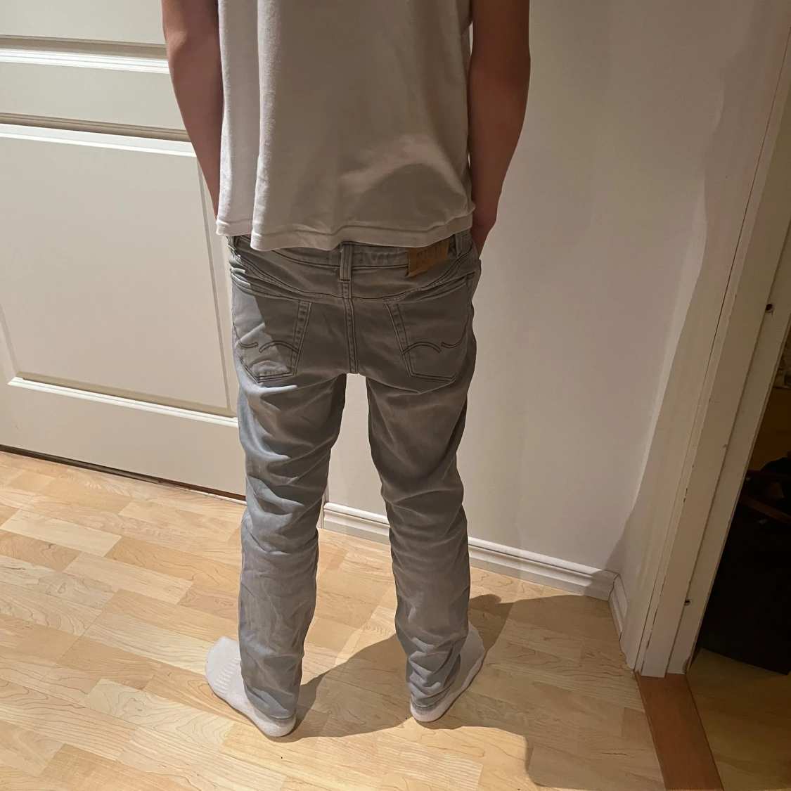Säljer ett par grå jeansbyxor i bra skick. De har en normal passform och är perfekta för både vardag och fest. Byxorna har en klassisk design med fem fickor och en knappgylf. Perfekta för höst och vår!