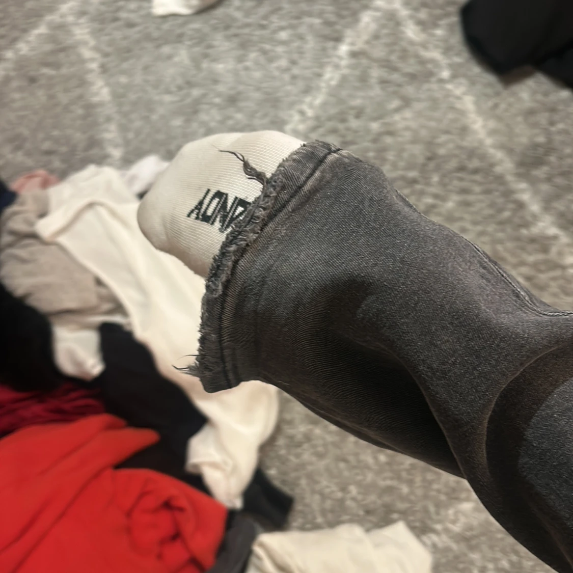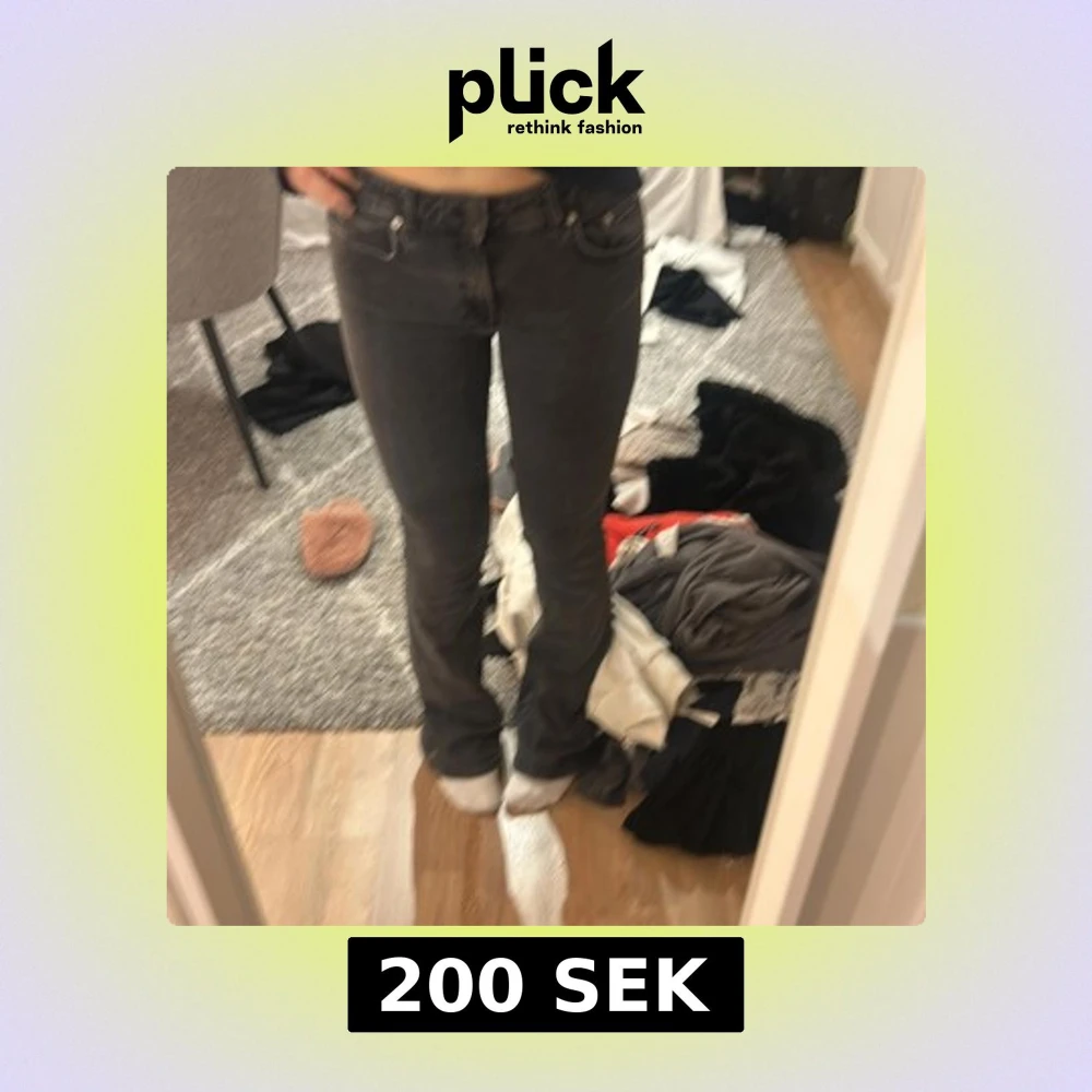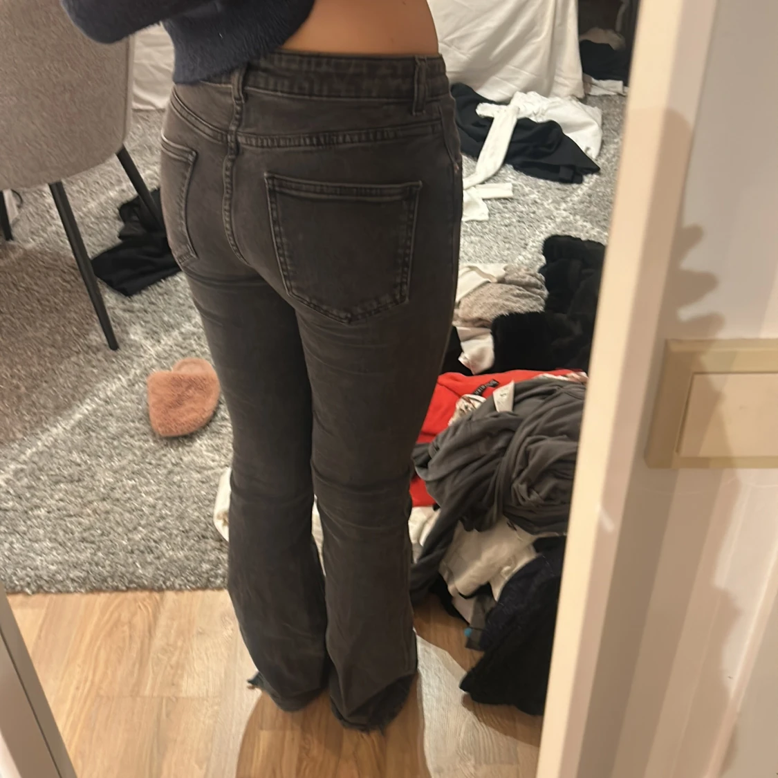 Snygga grå jeans med bootcut-stil. De har en klassisk femficksdesign och är perfekta för en avslappnad look. Jeansen har en lågmidjad passform och är tillverkade i ett bekvämt denimtyg. Har slitning längst ner då jag är för kort för dem