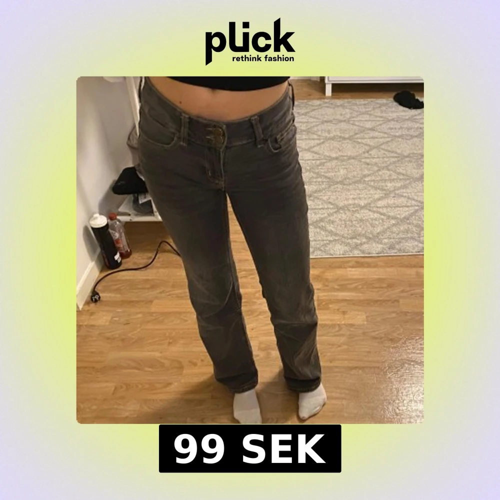 Snygga grå jeans med bootcut och låg midja. De har dubbla knappar i midjan. De är bra skick men de är två fläckar som säkert går bort i tvätten har bara inte testat❣️