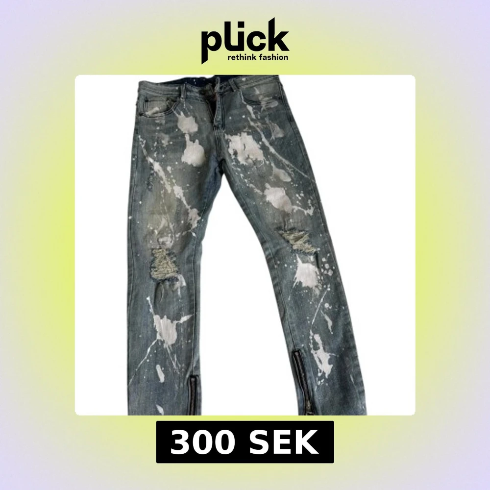 Snygga grå jeans med coola vita färgstänk, slitna detaljer på knäna och dragkedjor vid bensluten. Jeansen har en rak passform och fem klassiska fickor. Perfekta för dig som vill sticka ut med en edgy streetstyle.