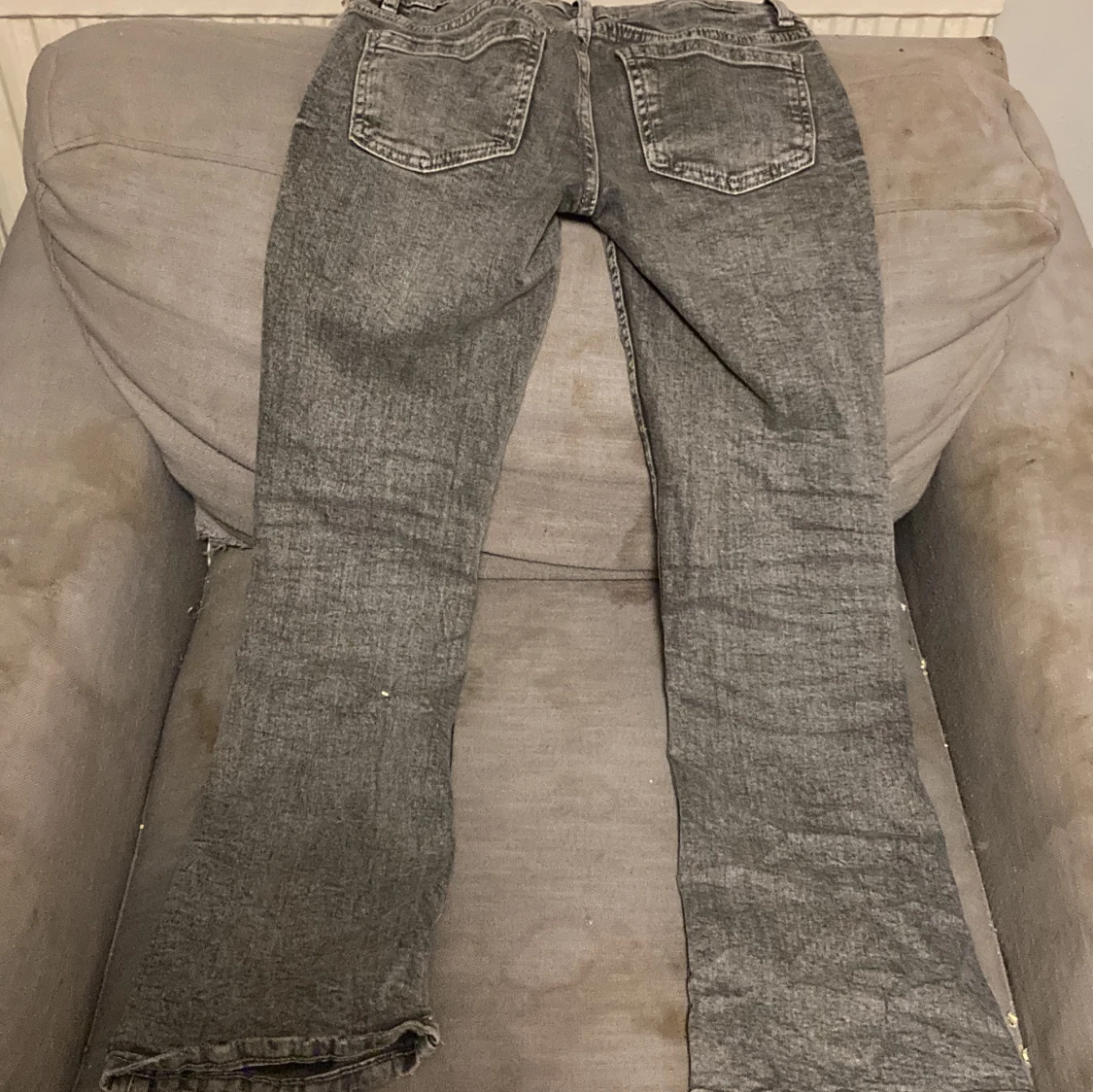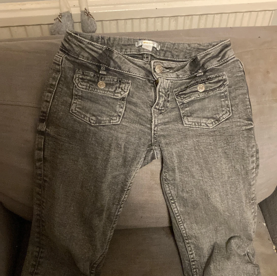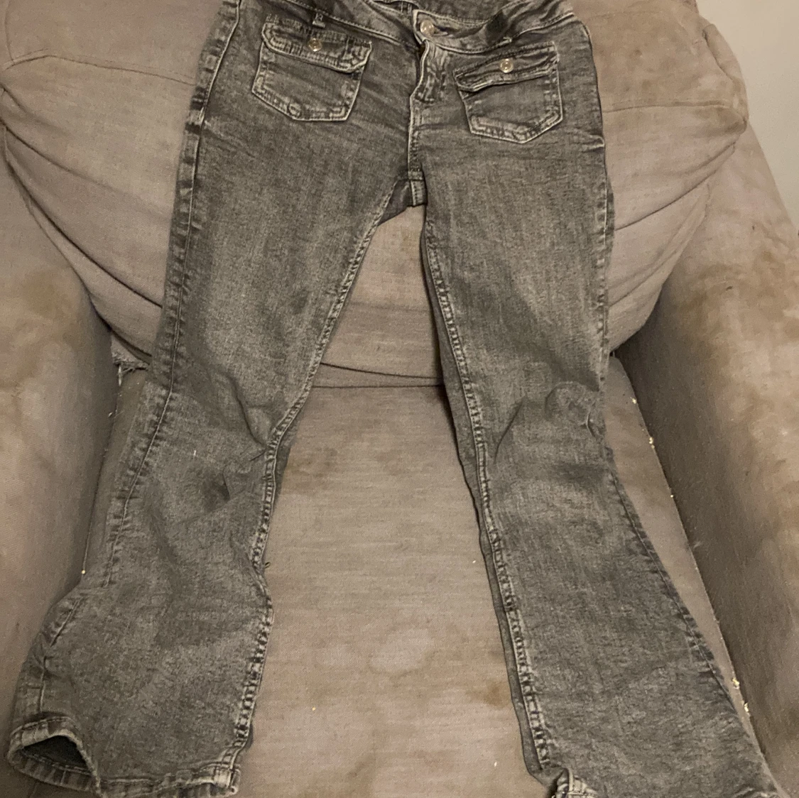 Snygga grå jeans med två framfickor med knappar. De har en klassisk design med en rak passform och är perfekta för en avslappnad stil. Jeansen har en dragkedja och knappstängning.
