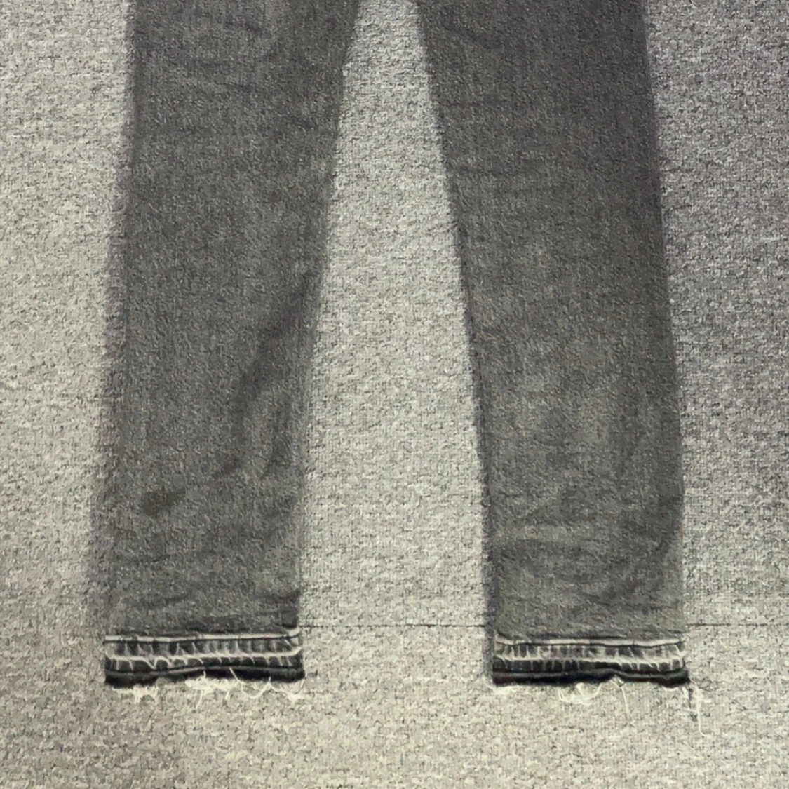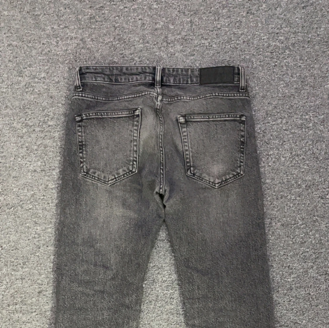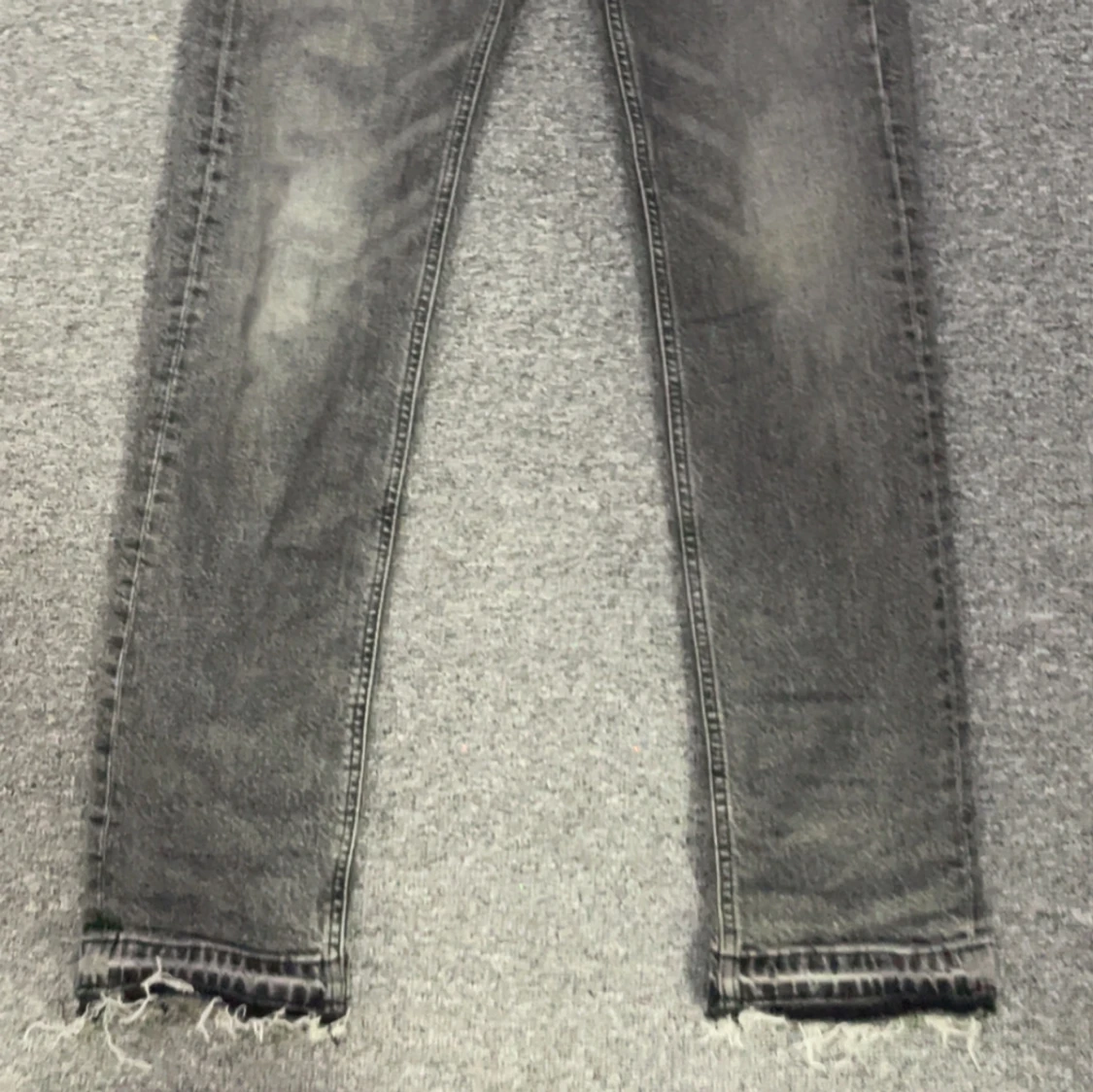 Snygga grå jeans med slitna detaljer och råa, fransiga benslut. Jeansen har klassisk femficksdesign och dragkedjegylf. Perfekta för en avslappnad och trendig look.