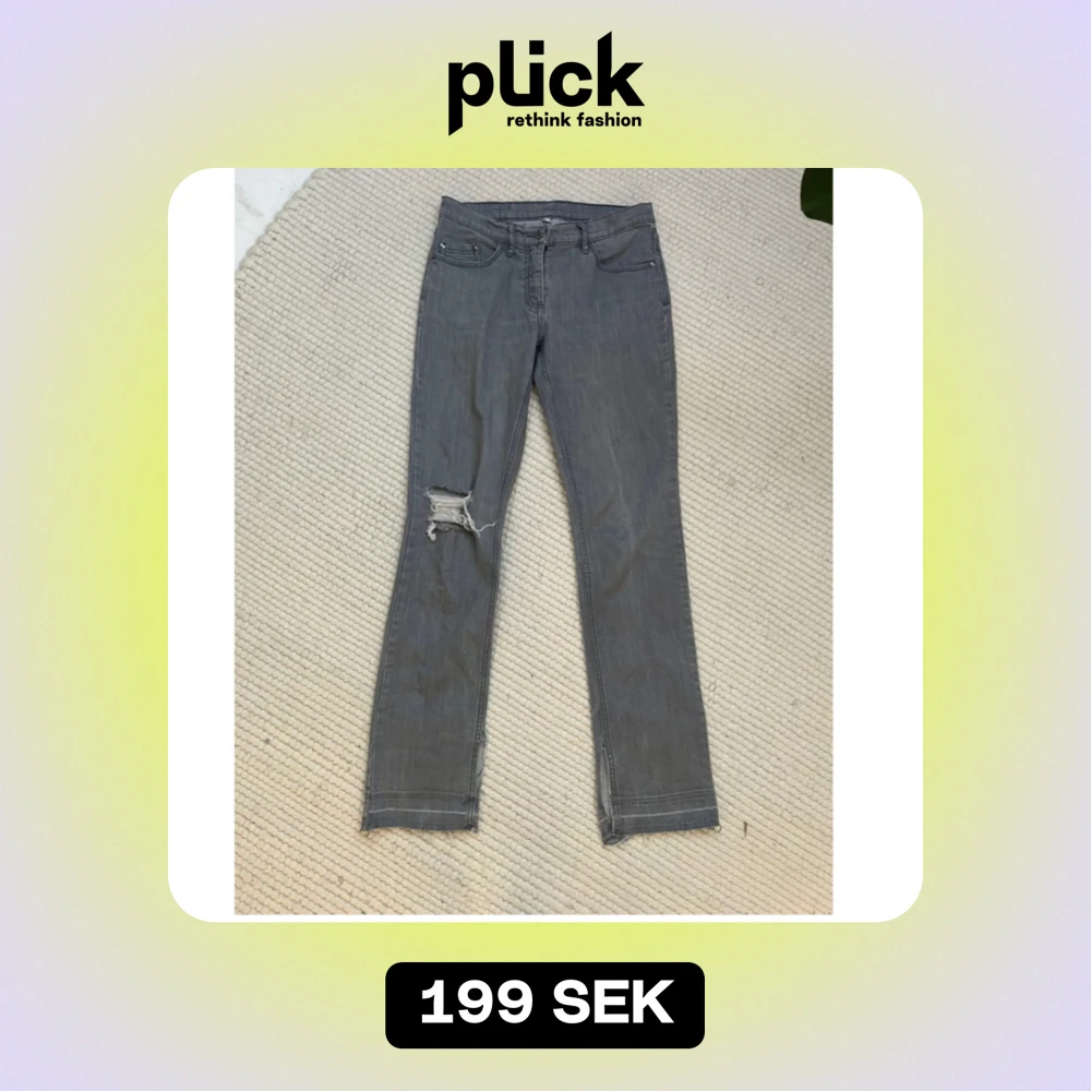 Säljer ett par grå jeans med coola slitningar på ena benet. Jag har själv klippt en slits på vardera ben på innersidan.