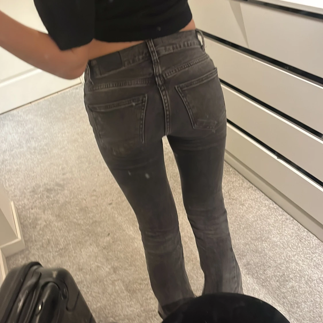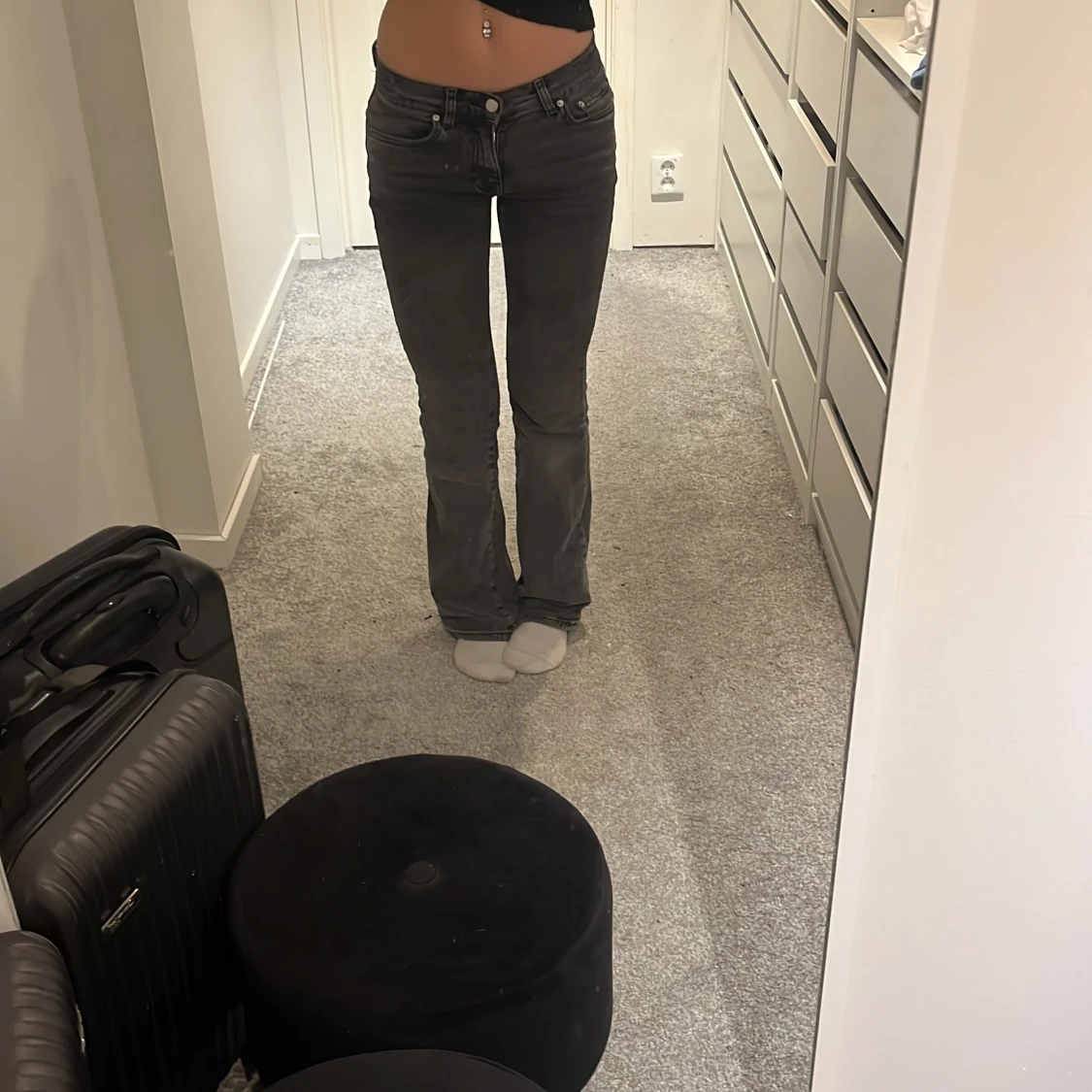 Snygga grå jeansbyxor. Lågmidjade och sparsamt använda.