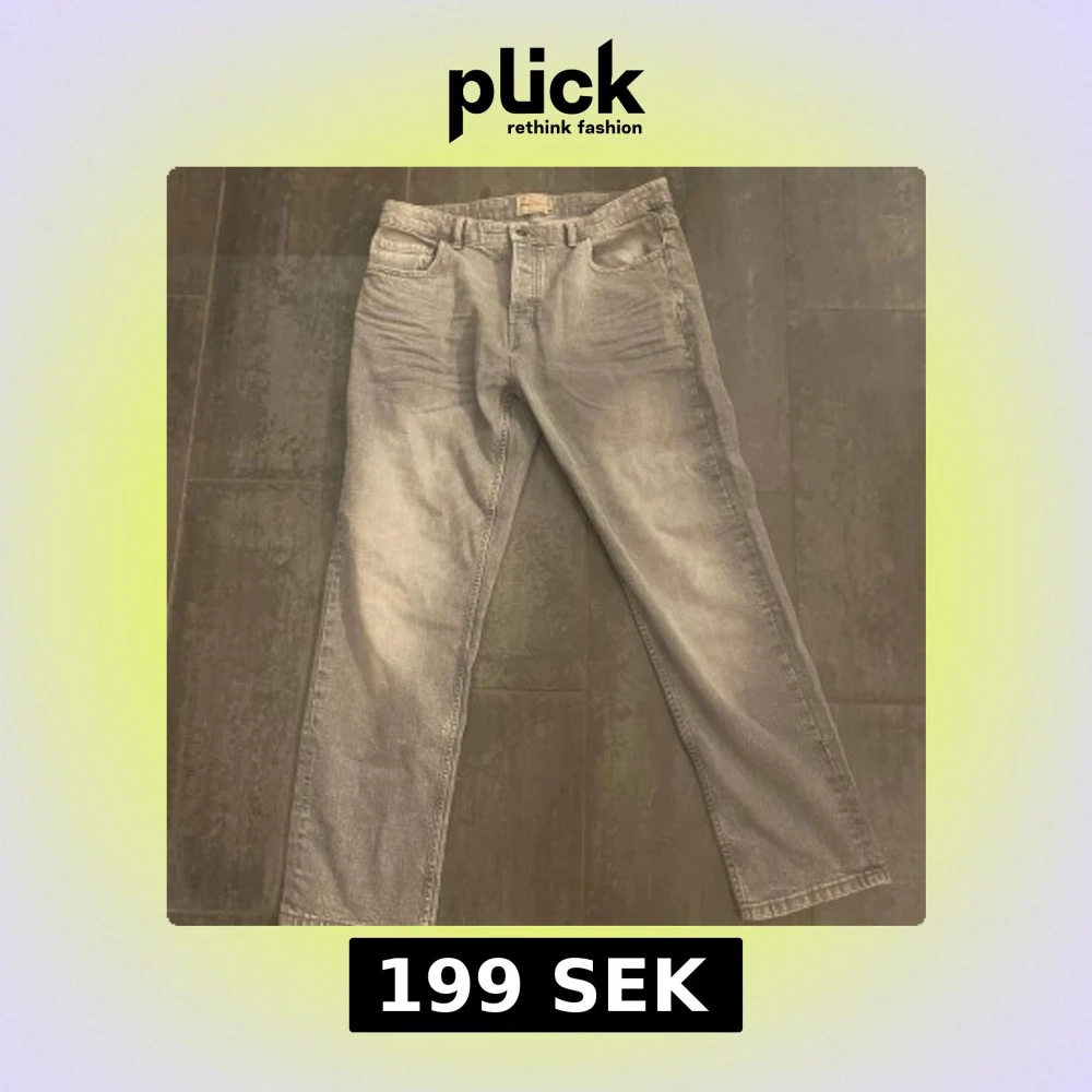 Snygga grå jeansbyxor med en straight passform. De har klassiska fyra fickor och en knappgylf. Perfekta för en avslappnad stil. Jeansen är stretchiga och har storleken 36 i midjan och 33 i längd. Aldrig använd