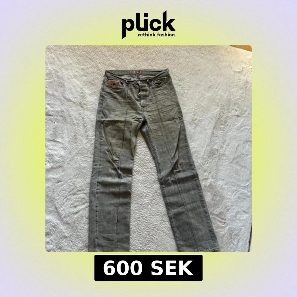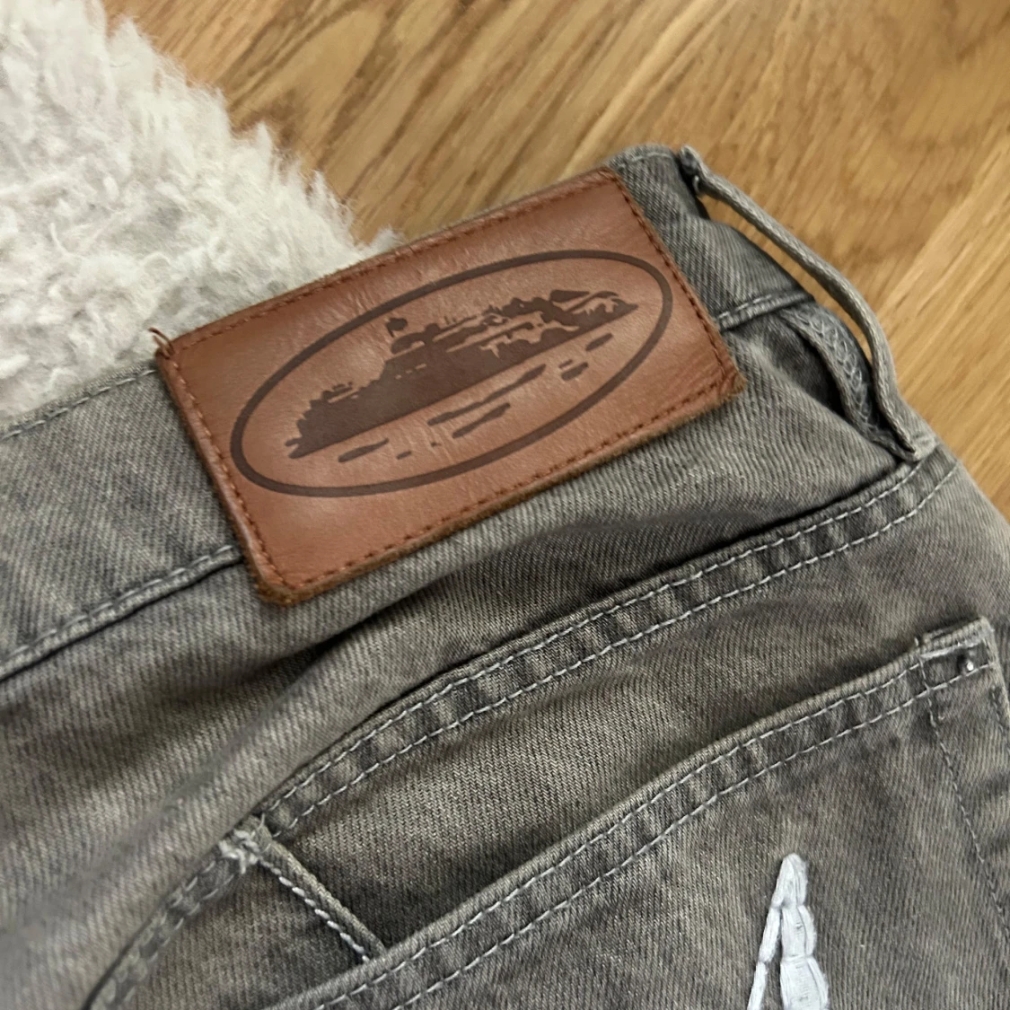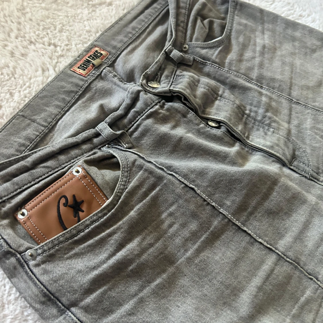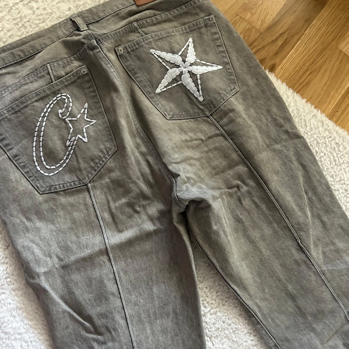 Säljer ett par grå jeansbyxor från Corteiz med coola broderade stjärnor på bakfickorna och en unik läderpatch fram. Byxorna har raka ben, knappgylf och tydliga sömmar längs benen. Materialet är klassisk jeans och passformen är normal.