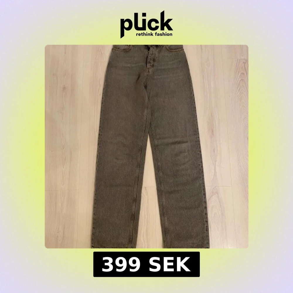 Säljer ett par raka grå jeans från Eytys med klassisk femficksdesign och synliga kontrastsömmar. Byxorna har hög midja och stängs med knapp och dragkedja. Perfekta för dig som gillar en stilren och enkel look.
