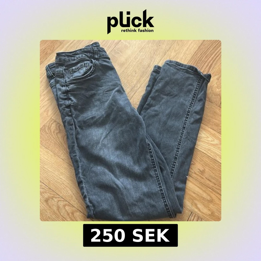 Säljer ett par snygga grå jeans från Mango med klassisk femficksdesign och silverfärgad knapp. Byxorna är slim fit och är perfekta för en avslappnad stil. Materialet är mjukt och bekvämt och storleken passar mellan 160-173cm beroende på hur tajta man vill att de ska va!