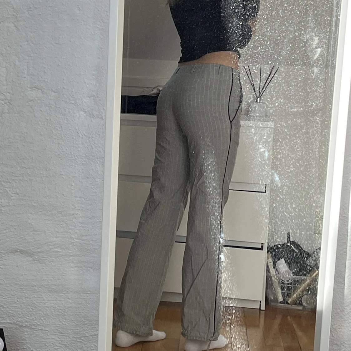 Gråa sträva kostymbyxor i storlek 34. Passar personer runt 160 eller kortare. Går att knyta längst nere vid fötterna!☺️💗
