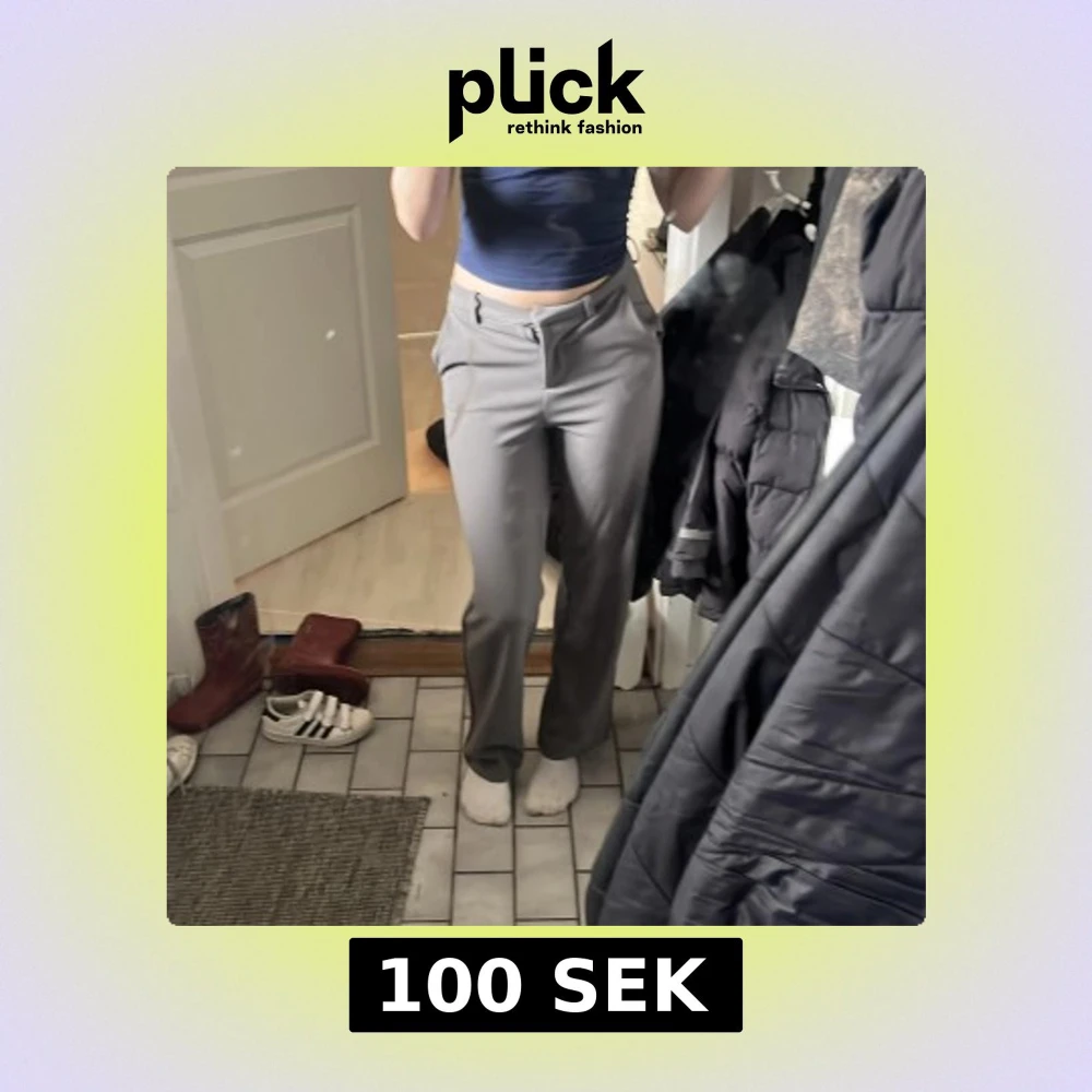 Snygga grå kostymbyxor med normal passform och hög midja. Perfekta för en stilren look. Byxorna har en klassisk design med dragkedja och knappar framtill.