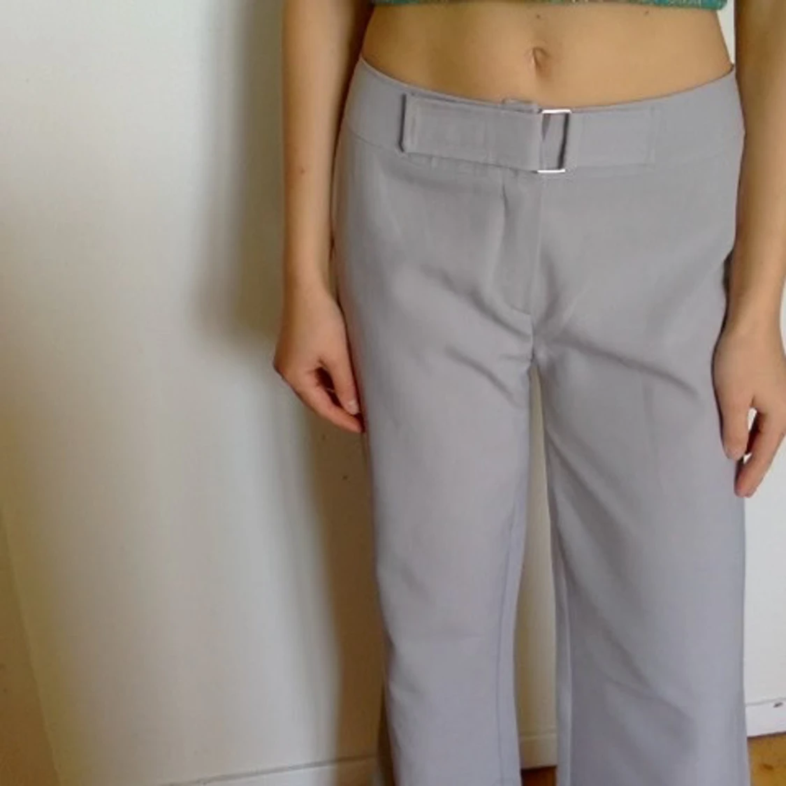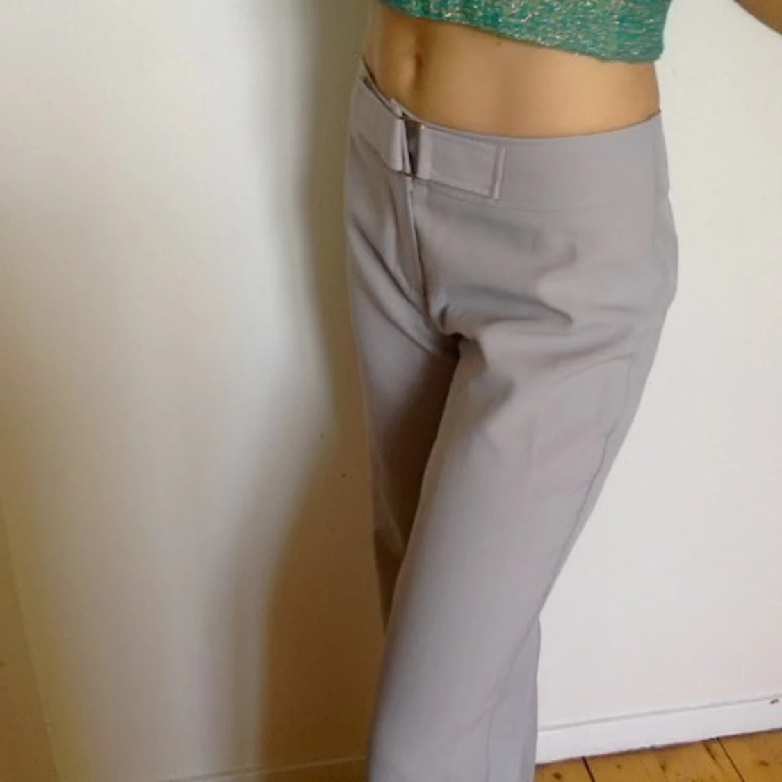 Mattgrå kostymbyxor med fint fall och kardeborre-bälte